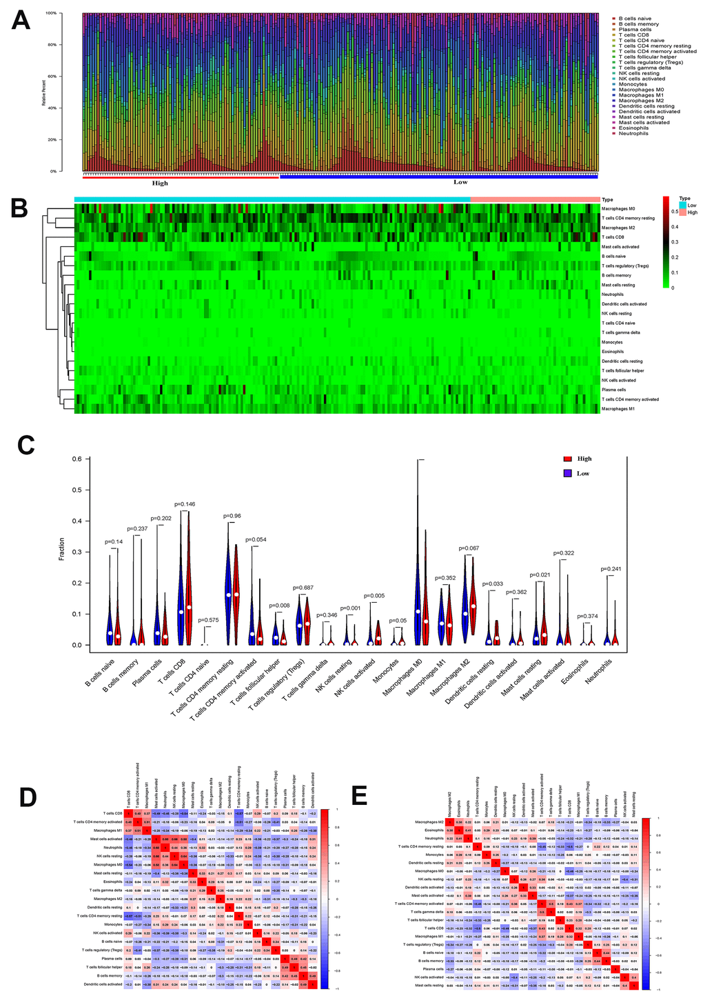 Using normal gene expression data, the relative proportions of 22 different genotypes were calculated using the CIBERSORT algorithm to infer infiltrating immune cells. For the TCGA data set, ‘voom’ (variance model at the observation-level) was used to convert RNA sequencing data and convert count data to values closer to the microarray results [21]. The 22 cell types inferred by CIBERSORT included B cells, T cells, natural killer cells, macrophages, dendritic cells, eosinophils, neutrophils, and etc. CIBERSORT is a deconvolution algorithm that uses a set of data that is considered to be the smallest expression level of each cell type and represents the data corresponding to the reference gene expression value (547 genes in the "signature matrix"). Based on these algorithms, it could then infer the proportion of cell types in tumor samples [22]. CIBERSORT used Monte Carlo sampling to obtain a p-value for the deconvolution of each sample, thus providing an interval measure of the result. The gene expression data set was written using standard annotation files and data uploaded to the CIBERSORT web portal (http://cibersort.stanford.edu/). The algorithm uses the default signature matrix with 1000 permutations. Heat maps were drawn to illustrate the infiltration of tumor immune cells in different patients, and by analyzing the correlation between immune cells in different mutation groups, correlation heat maps were drawn. In order to explore the differences in infiltrating immune cells in different mutation groups, a violin plot was plotted for visual display.
