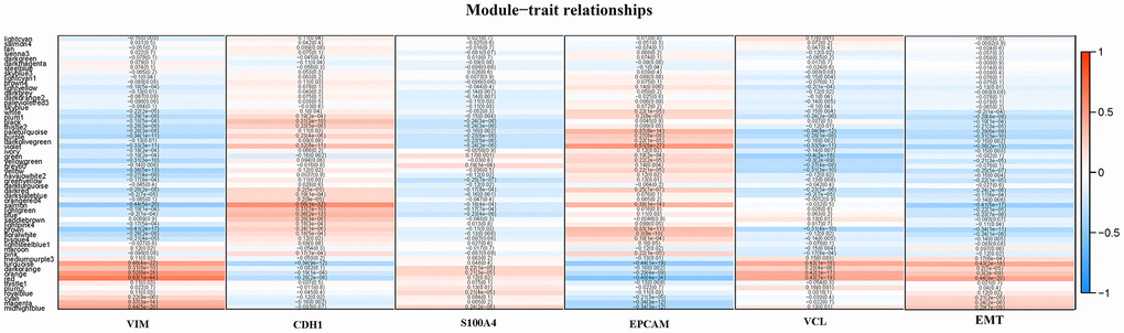 The gene set of the Turquoise module was submitted to the protein-protein interaction analysis in STRING software, and the binding confidence interval of the cutoff value was set to 0.4. In the plugin Molecular Complex Detection (MCODE), the significant models with strong protein-protein connection were calculated and selected, with the default parameters (degree cut ≥ 2, node score cut ≥ 2, K-core ≥ 2, maximum depth = 100). P < 0.05 was considered statistically significant. By sorting the candidate genes in node degree, the core genes were selected for further analysis. Supplementary Figure 6A, 6B showed the hub gene in the Turquoise module, and within, VCL played a central role, showing that VCL was the core gene that caused NK cell infiltration. In order to study the specific role of VCL, GSEA method was used to analyze the pathways enriched by high expression and low expression of VCL. As seen in Supplementary Figure 7, VCL was not only related to immune-related pathways, but also closely related to EMT-related pathways. In order to clearly illustrate the correlation between VCL, VIM, CDH1, S100A4, and EPCAM and EMT, another WGCNA was run. The interaction between 57 modules was analyzed and a network heat map was plotted (Figure 3). The specifics of the WGCNA can be found in Supplementary Figure 8 and Supplementary Table 3. Among them, Red and EMT were positively correlated, indicating that the Red module has the strongest correlation with EMT. The genes of the Red module were analyzed (see Supplementary Figure 9) and results showed that the Red module was related to EMT-related signal pathways, further explaining the function of the Red module. It was also compatible with VIM (R = 0.63, P < 0.001), S100A4 (R = 0.12, P = 0.02), VCL (R = 0.43, P < 0.001). It was negatively correlated with CDH1 (R=0.28, P < 0.001), and EPCAM (R=0.48, P<0.001). Supplementary Figure 10 illustrated the relationship between the number of module members in Red and GS. Through the use of WGCNA, the correlation between VCL and EMT was found to be relatively strong.