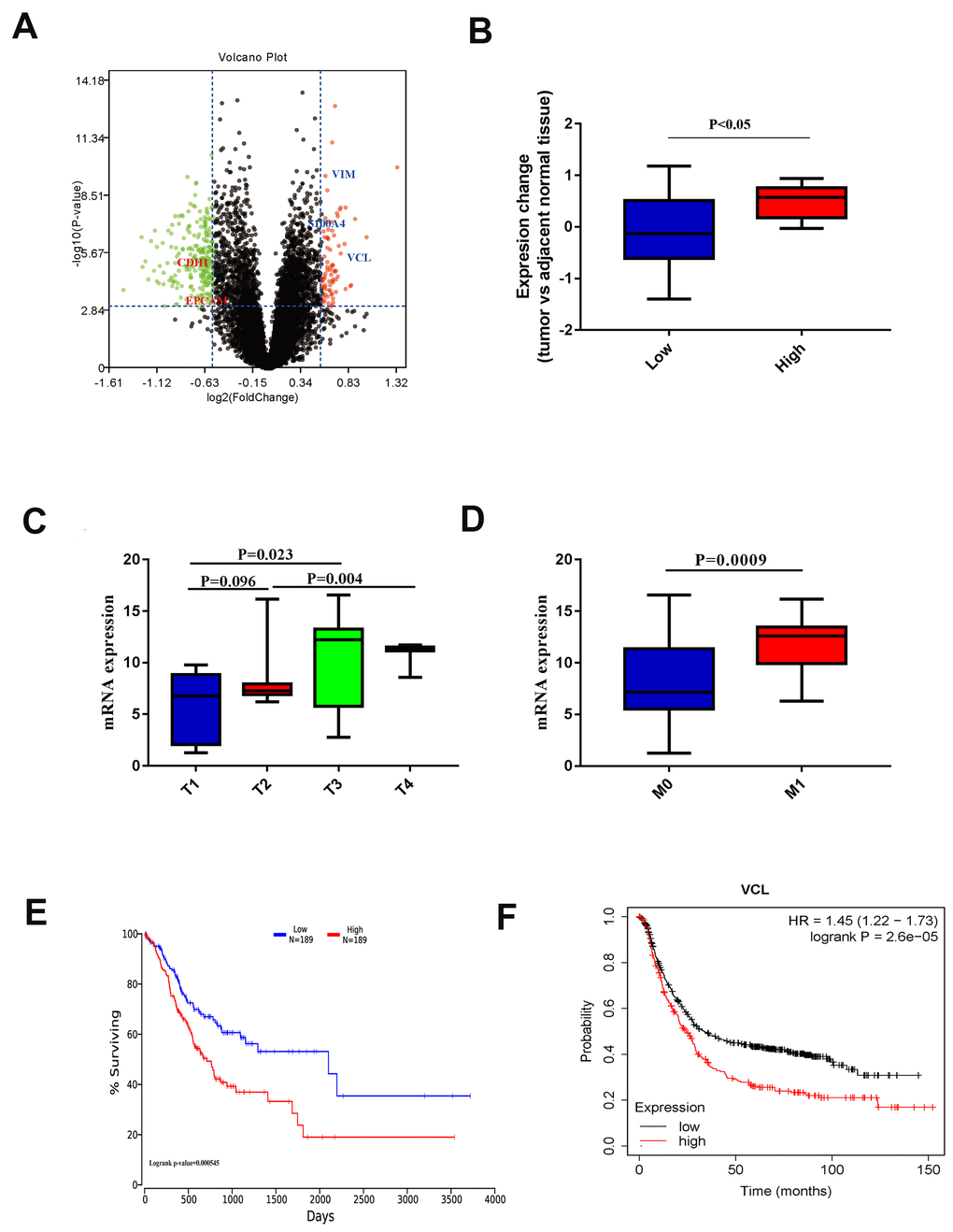 Using the levels of EMT indicators, 19 EMT patients and 111 non-EMT patients were sorted into groups. Differential expression analysis was performed and a volcano plot was drawn through the t-test in R package. Among them, highly expressed VCL in the EMT group had statistical differences as shown in Figure 4A. By comparing the expression of VCL in EMT and non-EMT however (Figure 4B), the expression of VCL was significantly up-regulated in the EMT group.
