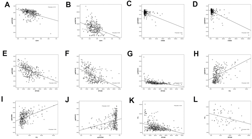 The methylation of 7 CpG sites and the expression of quantitative trait loci (meQTLs) were evaluated in the genome. Since promoter hypermethylation played an important role in the inactivation of cancer-related genes, genes with low methylation and high expression levels were of particular interest [22]. By analyzing the DNA methylation data of TCGA gastric cancer database, there were 12 DNA methylation sites in VIM, 8 in CDH1, 3 in S100A4, 7 in EPCAM, and 6 in VCL. Linear analysis of DNA methylation and RNA expression showed that RNA expression of CDH1 was negatively correlated with its DNA methylation sites cg01251360 and cg11667754 (Figure 6A, 6B). The RNA expression of S100A4 was negatively correlated with its DNA methylation sites cg07245635 and cg07587610 (Figure 6C, 6D). The RNA expression of EPCAM was negatively correlated with its DNA methylation sites cg03210866, cg03706175 and cg012942414 (Figure 6E–6G). Through linear analysis of DNA methylation of VCL and RNA of EMT-related RNA, VCL RNA expression was found to be positively correlated with EPCAM DNA methylation (cg03706175, cg03210866) (Figure 6H, 6I). The DNA methylation site cg12727040 of VCL was positively correlated with the DNA methylation site cg0370617 of EPCAM (Figure 6J, 6K). And the expression level of VCL is negatively correlated with the expression level of EPCAM (Figure 6L), indicating that VCL may negatively regulate EPCAM expression through RNA expression and DNA methylation. This may be the main target of EMT caused by VCL.