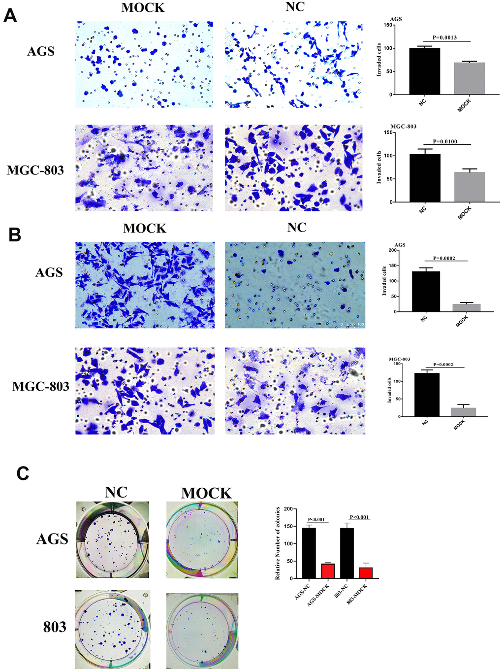The extracellular matrix (ECM) hydrogel was diluted with serum-free RPMl640 at a ratio of 1:1, and 30ul of Transwell polycarbonate membrane was added to each chamber to coat the ECM hydrogel. It was placed in a 37° C incubator for 15 minutes to let it solidify. After 16 hours, AGS cells and MGC-803 cells were digested with 2.5% trypsin, suspended in serum-free medium, and adjusted the cell density to 1×105/mL. 100ul of single cell suspension was added to the upper chamber of each chamber, and 600ul of culture medium containing 10% FBS was added to the lower chamber of the 24-well plate in the chamber, and it was set in a 37° C incubator for routine cultivation for 24 hours and 36 hours; each group containing a 3-cell parallel cell-culture chamber, and the experiment was repeated 3 times. After incubation, the chamber was removed, and the matrigel and cells in the upper chamber of the cell were gently wipe off, stained with 0.1% crystal violet for 5 minutes, the excess dye was rinsed off with water; the cells passed through the membrane were counted under a 200X microscope and taken photos of. 5 fields of view were randomly selected at the top, bottom, center, left, and right, and the average value was taken. Cell migration assay: a Transwell chamber that was not coated with ECM hydrogel was used, with 100-cell suspension added to the upper chamber of the chamber, and the rest is identical as in the invasion assay.