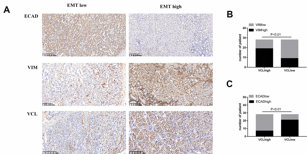 A total of 56 archived gastric cancer tissues were fixed with 4% paraformaldehyde, then paraffin-embedded, sectioned (5mm), deparaffinized, rehydrated, and antigen extracted. The tissue part was used to incubate the CAS blocking buffer and subsequently used to incubate the main antibody (E-Cadherin Antibody, Rabbit Polyclonal, PROTEINTECH, Catalog number: 20874-1-AP. Vimentin Antibody, Rabbit Polyclonal, PROTEINTECH, Catalog number: 10366-1-AP. Vinculin Antibody, Rabbit Polyclonal, Affinity Biosciences Cat# AF5122, RRID:AB_2837608). It was then overnighted at 4° C and DAKO envisio-hrp (DAKO) was used to check the reactivity afterward. By multiplying the percentage of positive cells (P) by the intensity (I), the degree of immunostaining is scored according to the following formula: H = P × I. The range of P is 0 to 4 (5% scored 0; 5-25% scored 1; 25–50% scored 2; 50–75% scored 3; 75–100% scored 4). The range of I is 0 to 3 (0, no staining; 1, weak; 2, medium; 3, strong). The staining index score was calculated by multiplying P by I, and the resulting range is 0-12. The staining index score is defined as followed: 0-3 as negative; 4-12 as positive.