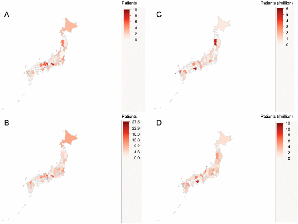 As the maps show, there were no statistically significant differences in the distributions of the patients with Werner syndrome throughout Japan in 2017. However, compared to the patient population per million people for each region in 2009 (Nagasaki 7.6 patients, Tokushima 6.3 patients, Nagano 5.5 patients, Miyazaki 5.3 patients) [7], there were some changes in 2017 (Nagasaki 5.9 patients, Tokushima 5.4 patients, Akita 5.0 patients, Saga 3.6 patients), which suggests that there were regional temporal changes in the incidence of Werner syndrome.