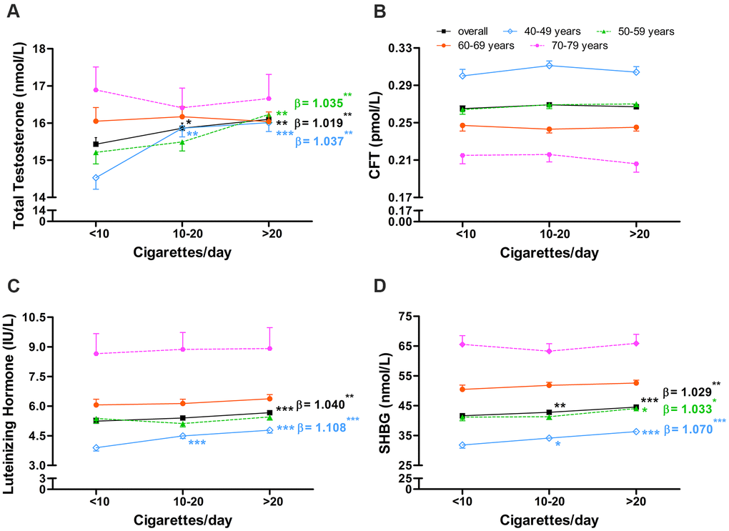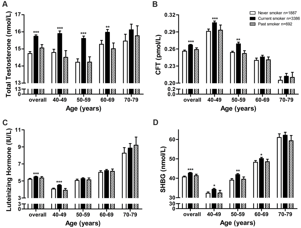 No positive associations between smoking and LH and SHBG levels were observed in men older than 50 or 70 years, respectively, which may reflect a weaker response by the pituitary gland and liver to cigarette smoking with aging. In addition, the similar sex hormone levels observed here between past smokers and never smokers across all age subgroups suggests that the pituitary gland and liver can restore appropriate levels of sex hormones after smoking cessation.