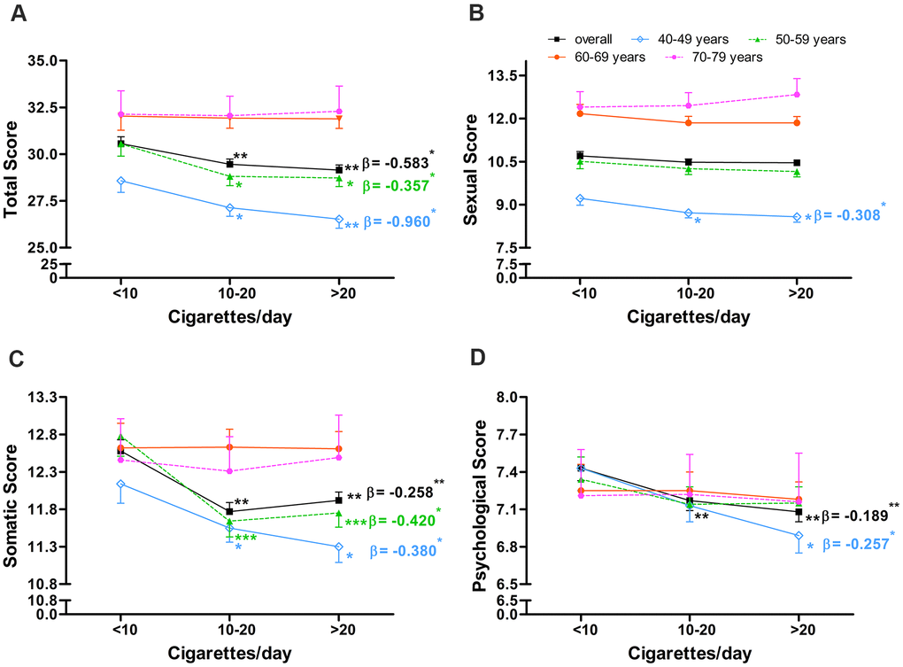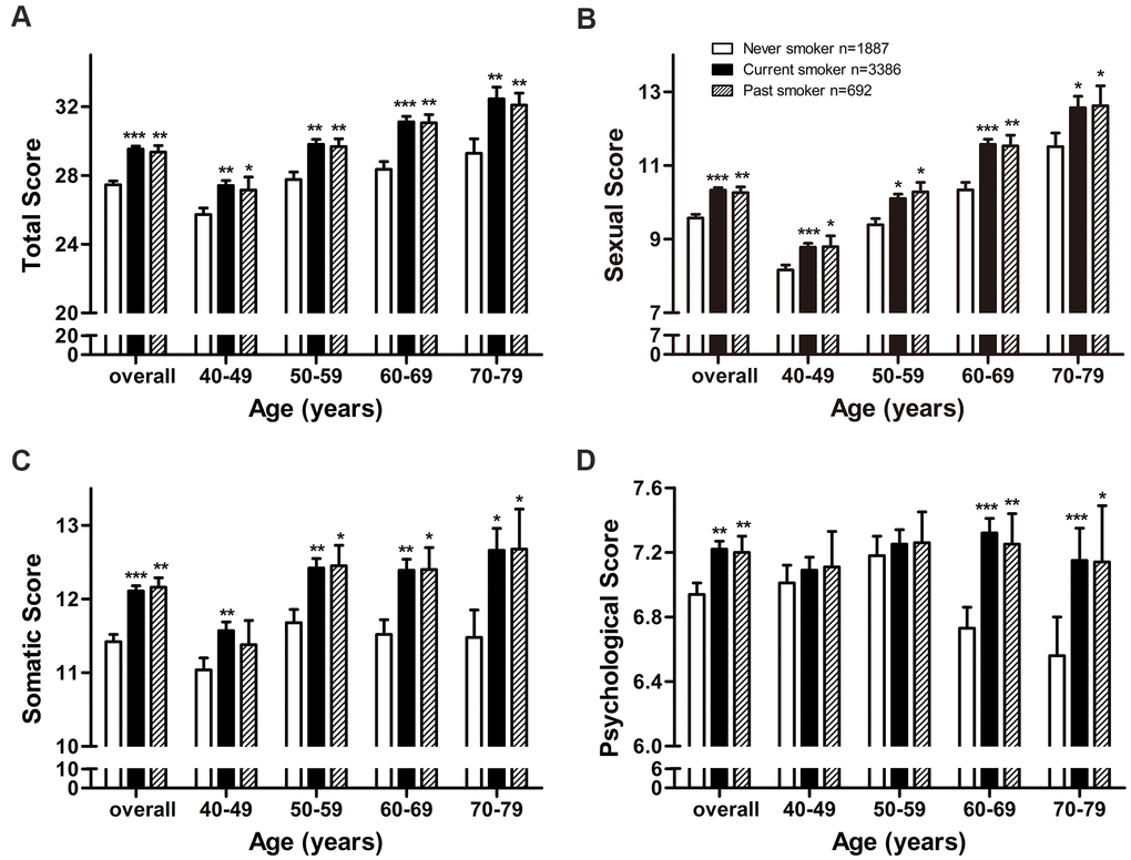 Total AMS score was significantly higher among current smokers (29.53, P < 0.001) and past smokers (29.36, P = 0.003) than among never smokers (27.45, Figure 3A), and higher scores for current smokers were observed in all four age subgroups. Similar results were observed for sexual score (Figure 3B) and somatic score (Figure 3C).