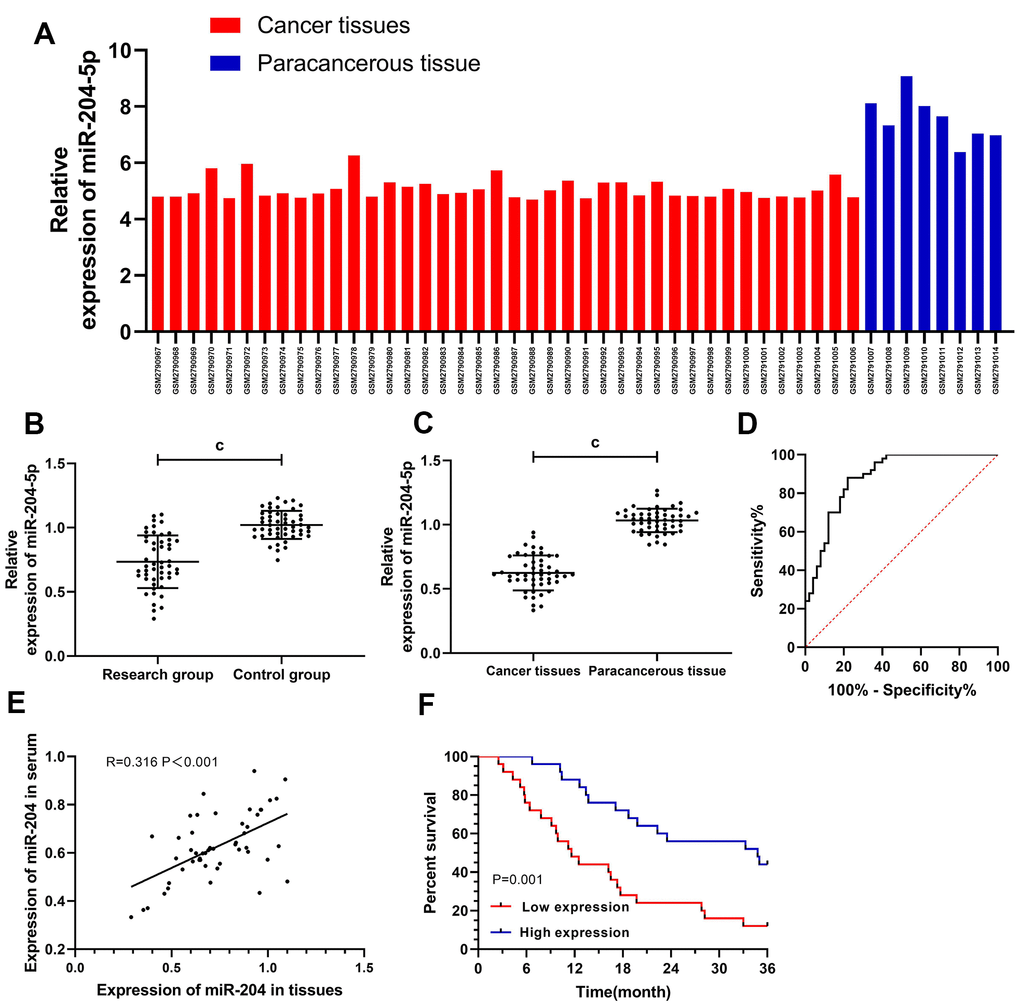 Analysis of miR-204 in the patient tissues with GC based on the database (Table 1) uncovered that miR-204 decreased in the patients (Table 2 / Figure 1A). The clinical analysis revealed low miR-204 expression in both serum (Figure 1B) and tissues of the patients (Figure 1C), and the two were positively correlated (R=0.316, P<0.001) (Figure 1D). Based on ROC curve analysis, the AUC of miR-204 was 0.884, and patients with low miR-204 showed high rates of having III+IV stage, distant metastasis, and low differentiation (Figure 1E). Survival analysis uncovered notably lower 3-year survival among patients with low miR-204 (Figure 1F) and multivariate Cox regression analysis (Table 3) denoted distant metastasis and miR-204 underexpression as independent factors for patients’ prognosis.