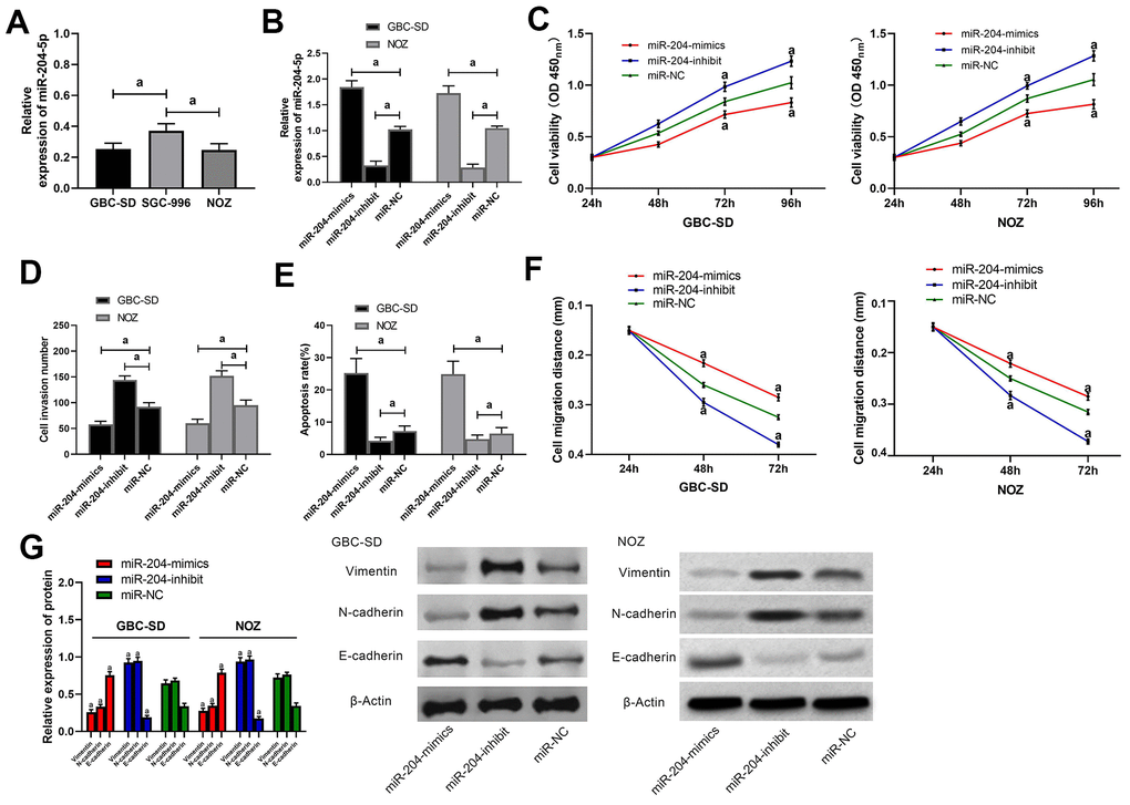Comparison among GBC-SD, SGC-996, and NOZ cells revealed that GBC-SD and NOZ cells showed an obviously lower miR-204 (Figure 2A). Therefore, we selected the two cells for further experiments. Cells were transfected by miR-204 mimics/ miR-204 inhibit /miR-NC (Figure 2B). As a result, those transfected with miR-204-mimics presented notably lower proliferation, invasion as well as migration and notably higher apoptosis than those with miR-NC (Figure 2C–2F) and also showed lower Vimentin and N-cadherin and higher E-cadherin (Figure 2G). In addition, cells transfected with miR-204-inhibit presented notably faster proliferation, invasion (Supplementary Figure 1) as well as migration (Supplementary Figure 2A, 2B) and notably lower apoptosis than those with miR-NC (Figure 2C–2F) and also presented higher Vimentin and N-cadherin, and lower E-cadherin than the latter (Figure 2G).