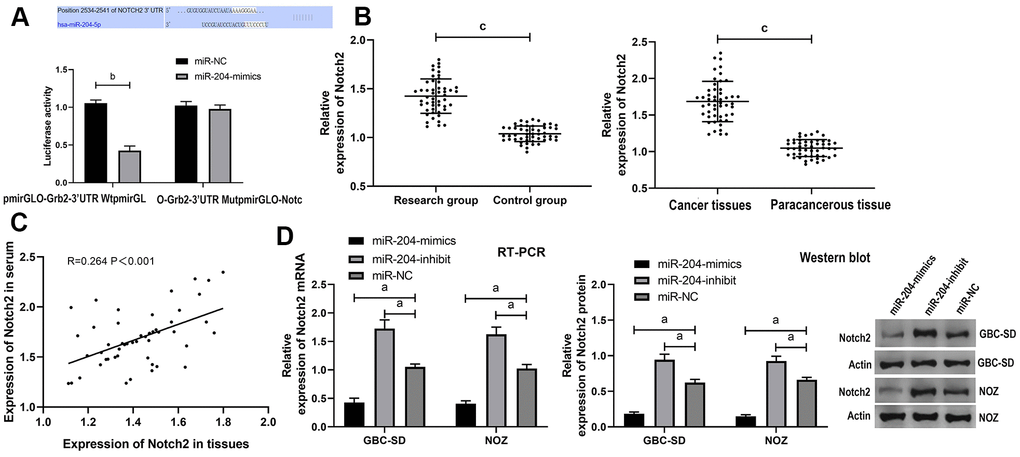 GBC-SD, SGC-996, as well as NOZ cells were incubated in DMEM containing10% FBS, 1X penicillin-streptomycin, in a humidified incubator at 37° C under 5% CO2. The cells were transfected with Lipofectamine™ 2000 kit to construct miR-204-mimics (over-expression sequence), miR-204-inhibitor, miR-NC, sh-Notch2, si-Notch2, and si-NC strictly under the kit guidance.