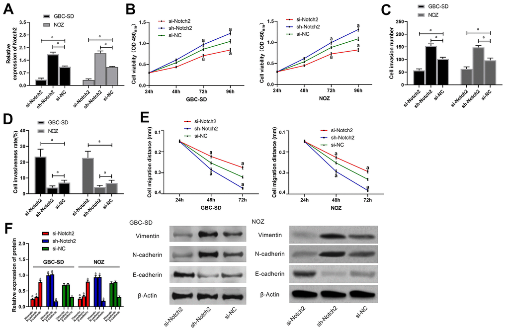 GBC-SD and NOZ cells were transfected with si-Notch 2, sh-Notch 2 or si-NC, and then the effects on Notch 2 were determined by qRT-PCR (Figure 4A). As a result, cells transfected with si-Notch2 (Notch2 knockdown) showed obviously lower proliferation, invasion as well as migration and greatly higher apoptosis than those with si-NC (control) (Figure 4B–4E) and also showed lower Vimentin and N-cadherin and higher E-cadherin than the latter (Figure 4F). In contrast, cells transfected with sh-Notch2 (Notch2 overexpression) presented greatly faster proliferation, invasion (Supplementary Figure 3) as well as migration (Supplementary Figure 4A, 4B) and greatly lower apoptosis than those with si-NC (Figure 4B–4E), and also presented higher Vimentin and N-cadherin and lower E-cadherin than the latter (Figure 4F).