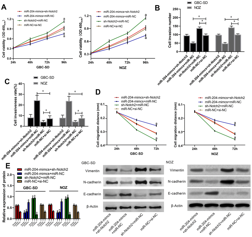 We transfected miR-204-mimcs+sh-Notch2, miR-204-mimcs+miR-NC, sh-Notch2+miR-NC, and miR-NC+si-NC into NOZ and GBC-SD cells and determined biological functions of the cells (Figure 5A), invasion (Figure 5B, Supplementary Figure 5), migration (Figure 5D, Supplementary Figure 6A, 6B), apoptosis (Figure 5C) rate, and Vimentin, N-cadherin, and E-cadherin (Figure 5E) (all P > 0.05). Cells transfected with miR-204-mimcs+miR-NC presented notably slower proliferation, invasion as well as migration, and notably faster apoptosis than those with miR-204-mimcs+sh-Notch2 or miR-NC+si-NC, and showed lower N-cadherin and Vimentin and higher cadherin. In addition, cells transfected with sh-Notch2+miR-NC presented notably faster proliferation, invasion, as well as migration, and notably slower apoptosis than those with miR-204-mimcs+sh-Notch2 or miR-NC+si-NC, and also presented. higher N-cadherin and Vimentin and lower E-cadherin.