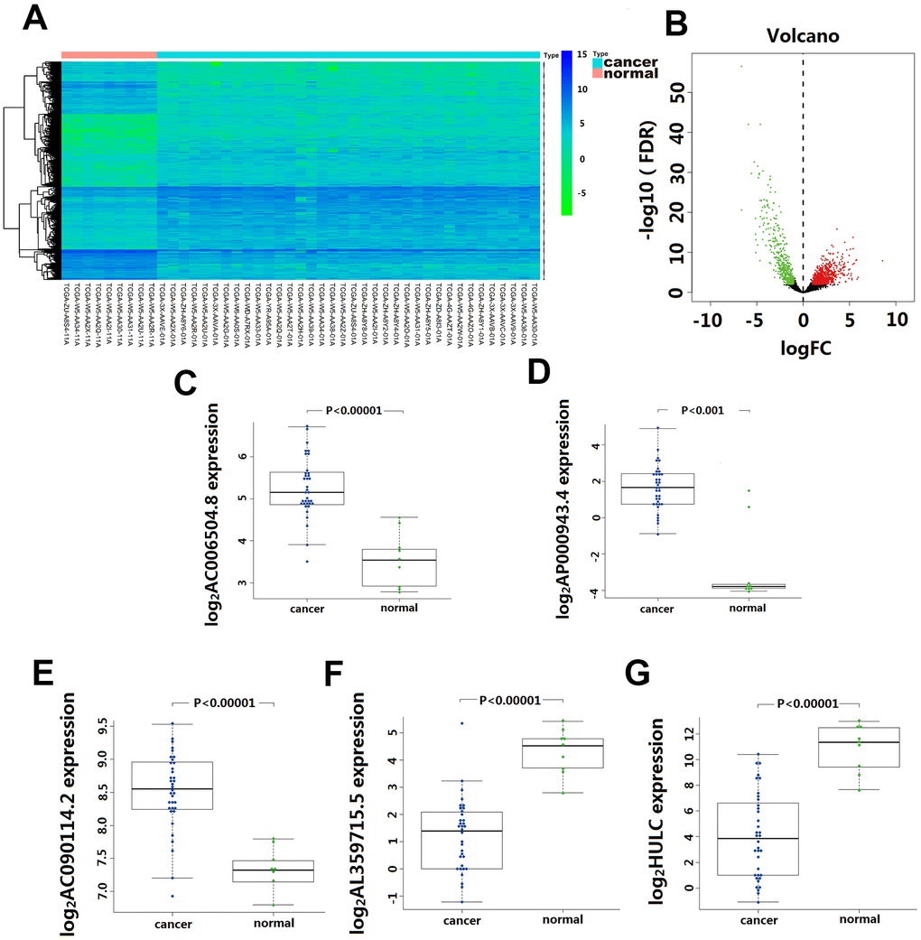 Univariate Cox regression analysis assessing the association between 1192 differentially expressed lncRNA and CCA patients’ overall survival in TCGA cohort, 10 lncRNA (LINC01336; AP000943.4; AC006504.8; AC090114.2; AC004921.1; AC134682.1; AL449106.1; AL359715.5; AC016876.1 and HULC) were selected for further multivariate Cox regression analysis. In this multivariate Cox regression analysis, five lncRNA (AC006504.8, AC090114.2, AP000943.4, AL359715.5, and HULC) were identified as independent predictors for CCA survival outcomes (Table 1). Among them, the expression of AC006504.8, AC090114.2, and AP000943.4 was up-regulated (Figure 1C–1E); expression of AL359715.5 and HULC was down-regulated (Figure 1F, 1G). Similarly, these 5 lncRNAs also showed similar behaviors in paired carcinoma and paracancerous tissues (Supplementary Figure 1). Based on these five lncRNA expression levels and their corresponding coefficient in multivariate Cox regression analysis, a five-lncRNA signature predictive model for CCA patients prognosis was established as follows: Risk Score= (0.6542 × expression level of HULC) + (-1.2388 × expression level of AL359715.5) + (1.3769 × expression level of AC006504.8) + (-3.6697 × expression level of AC090114.2) + (-1.5165 × expression level of AP000943.4).