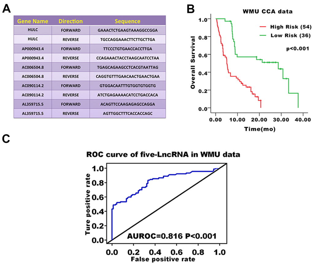 We validated the prediction ability of the five-lncRNA signature model in the WMU cohort to assess the robustness of the model for survival prediction in patients with CCA. Based on the five-lncRNA model and cutoff point derived from the TCGA cohort, patients in the WMU cohort were divided into high-risk group (n=54) and low-risk group(n=36). We compared the KM curve between these two groups and found that the OS of patients in the high-risk group was worse than those in the low-risk group (p<0.001, Figure 3B). The AUC value was 0.816 in the WMU cohort (Figure 3C).