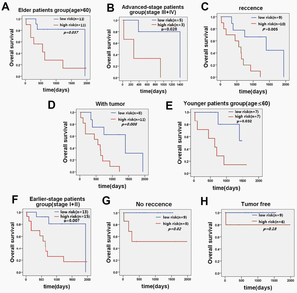 Further stratified analysis showed that the five-lncRNA signature model could accurately distinguish the prognosis between the high-risk group and the low-risk group in young patients <60 years (n=14, p=0.032, Figure 4E) and older patients ≥60 years (n=22, p=0.037, Figure 4A). Similarly, stratifying the patients based on the stage of disease, revealed that the five-lncRNA signature model has good discriminatory ability for earlier-stage patients (n=28, p=0.007, Figure 4F) and advanced-stage patients (n=8, p=0.028, Figure 4B). For patients with or without recurrence, the five-lncRNA model could divide patients into the high-risk or low-risk groups in those with recurrence (n=19, p=0.005, Figure 4C) and without recurrence (n=17, p=0.02, Figure 4G). Moreover, the five-lncRNA signature model could separate the high-risk group and low-risk group for patients with tumors (n=19, p=0.008, Figure 4D) and those who were tumor-free (n=15, p=0.18, Figure 4H). Multivariate Cox regression analysis combined with stratification analysis showed that there was no significant difference in OS between the high-risk and low-risk groups with five-LncRNA markers in tumor-free patients, and it this suggests that patients in the early stages of tumor development may benefit significantly from these prognostic biomarkers.