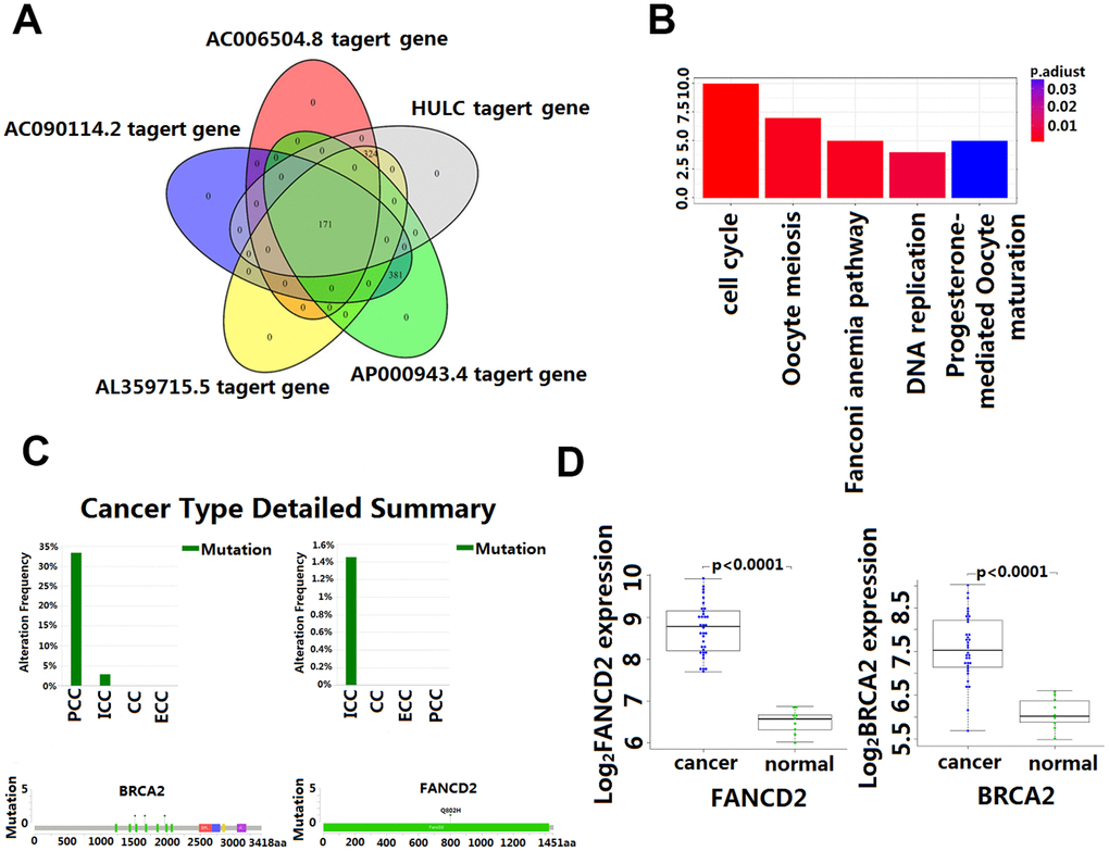 Although the study of the lncRNA function has attracted more and more attention and a great number of lncRNA have been identified in the human genome, the function of most lncRNA has not been fully revealed. Functional annotation of the gene encoding the lncRNA-associated co-expressed protein is a viable method for finding the biological characteristics of lncRNA [31]. By extension, annotation of LncRNA function through co-expressed genes was reported to be effective [34]. In this study, GO and KEGG enrichment analysis was used to identify co-expressed mRNAs of the five lncRNA to speculate on the functions of the predictive lncRNA. Our data revealed that the HULC and AL359715.5 participated in a number of biological processes that were most relevant to the cholesterol and fatty acid metabolism which is reported to be responsible for the growth and accelerated development of CCA [34, 35]. Also, of interest is the identification of the complement and coagulation cascades that are involved in many physiological and pathological processes, including those in the inflammatory process which, once dysregulated become an important factor in tumorigenesis [36]. In this study, we found that AC006504.8 was enriched in the p53 signaling pathway. The molecular epidemiological analysis revealed that p53 is mutated in almost all kinds of tumors, and approximately 5% of patients with colorectal cancer, lung cancer, melanoma, sarcoma, head and neck cancer, leukemia, esophageal cancer, ovarian cancer, testicular cancer, and cervical cancer have been found to have p53 mutations [37, 38]. Of significance to this study is the amount of research that has indicated p53 inactivation plays a key role in the occurrence and development of CCA [39]. The mechanisms by which AC006504.8 is involved in CCA are probably related to cell cycle and DNA replication. The 171 DPCGs intersected by the five-lncRNA signature were enriched in the function of the Fanconi anemia (FA) pathway. Fanconi anemia is a recessive genetic disorder characterized by congenital malformation, bone marrow failure, and high susceptibility to cancers [36, 40]. It is a cancer susceptibility gene involved in the repairing of genomic damage and maintaining genomic stability [41]. Recent evidence indicates that genetic instability is a key factor in the metastasis and recurrence of malignant tumors. Many studies have shown that mutations and abnormal expression of the FANCD1 and FANCD2, two major genes in the Fanconi anemia pathway, are significantly associated with poor prognosis of CCA [42]. Our study also showed that FANCD1 and FANCD2 mutated to different degrees in CCA (Figure 5C), and their expression in CCA and matched para-carcinoma tissues was also significantly different (Figure 5D). These results would seem to suggest that the predictive five-lncRNA may mediate the development and progression of CCA via DPCG interactions in biological processes related to cancer. However, more experimental studies are needed to further explain the potential roles of these lncRNA in CCA. To our knowledge, four out of the five lncRNA biomarker functions have never been reported. Therefore, we postulate that further investigation of the function of the lncRNA will contribute to early diagnosis and provide a clinical basis for the development of new prognostic factors in CCA.