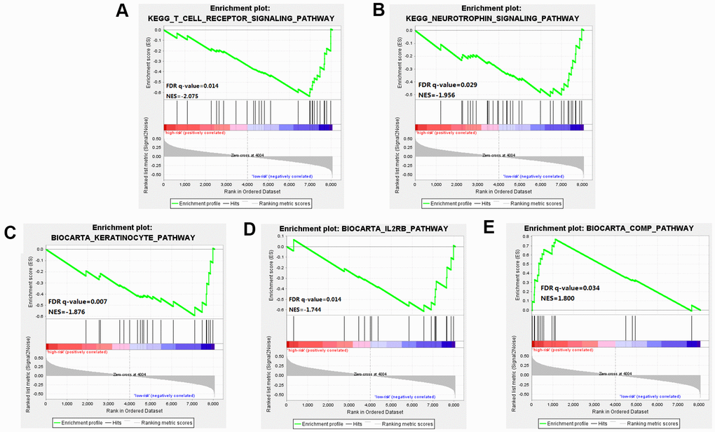 Through GSEA analysis, we clarified the significant difference in survival between the high-risk and low-risk groups. The results showed significant enrichment of markers including the "complement pathway" in the high-risk group. Pathways including IL-2 Receptor Beta Chain in T cell Activation, Keratinocyte Differentiation, T cell receptor pathway, and Neurotrophin signaling pathway were enriched in the low-risk group [18], many of these being closely related to the occurrence and development of cancer [19] (Figure 6 and Supplementary Table 2).