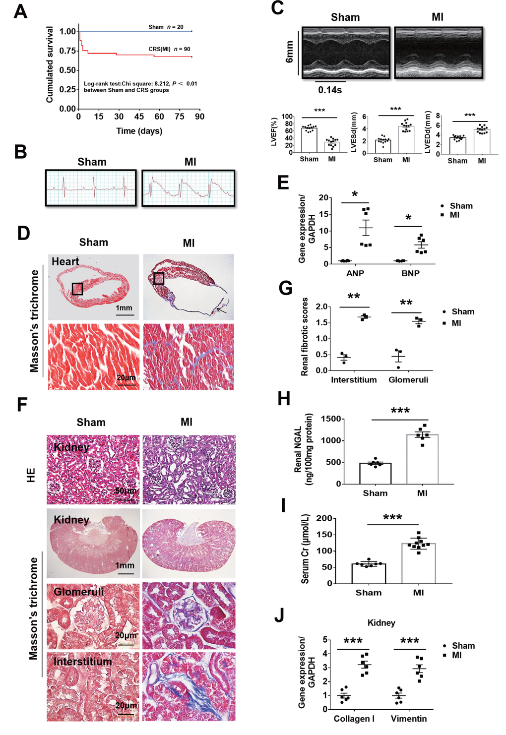 Cardiorenal syndrome (CRS) is a pathophysiologic disorder of the heart and kidneys, whereby acute or chronic dysfunction in one organ induces acute or chronic dysfunction in the other organ. In 2008, Ronco et al. proposed five subtypes of CRS according to the temporal sequence of organ failure as well as the clinical context [1]. CRS type 1 or acute cardiorenal syndrome (CRS-1) is characterized by an acute cardiac disease leading to acute kidney injury. The most common etiologies for an acute cardiac disease include acute decompensated heart failure, acute coronary syndrome and cardiac surgery [2]. Myocardial infarction (MI) may lead to cardiorenal dysfunction, which is termed CRS and is recognized as a major public health problem due to its high morbidity and mortality [3, 4]. Type 2 CRS is characterized by chronic heart failure leading to chronic renal dysfunction. However, the underlying mechanisms of CRS remains poorly defined and current therapeutic options are limited. Therefore, it is urgent to search for new treatment targets in CRS and develop more effective therapeutic approaches [5].