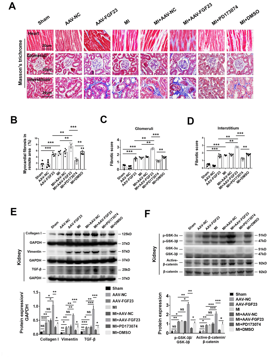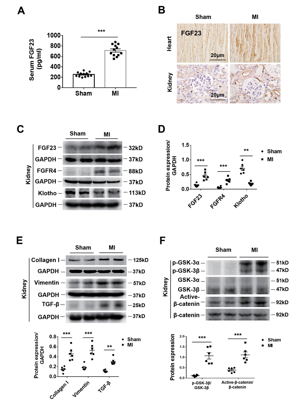 Ten-week-old male C57BL/6 mice (provided by our university Experimental Animals Center) were anesthetized by inhalation of 2% isoflurane, and MI was induced by permanent ligation of the left coronary artery as described elsewhere [68]. Some mice were injected with adeno-associated virus (AAV carrying the FGF23 gene or a negative control (NC) into the myocardium at 4 weeks before MI. Some mice were intraperitoneally given a pan-FGF receptor antagonist PD173074 (10 mg/kg/d, Sigma-Aldrich, Darmstadt, Germany) [prepared in 12.5% cremophor EL containing 2.5% dimethyl sulfoxide (DMSO)] or orally administered a β-catenin antagonist IGC001 (5 mg/kg/d, Selleck, TX, USA) (dissolved in 2% DMSO + 50% polyethylene glycol 300 + 5% Tween 80 + ddH2O) or initiated the same volume of DMSO at 4 weeks after MI and persisted for 8 weeks. After 12 weeks of observation, mice were sacrificed with an overdose of pentobarbital sodium (150 mg/kg intraperitoneally) and cervical dislocation. The hearts and kidneys were harvested and weighed for further analysis. For histological examinations, hearts and kidneys were fixed in 4% paraformaldehyde, whereas for molecular analysis the hearts and kidneys were snap-frozen in liquid nitrogen and stored at -80° C until used.