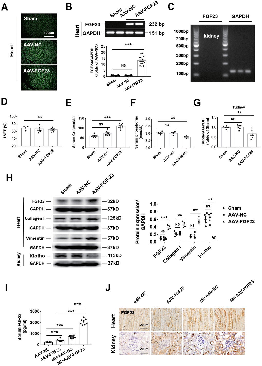 Intra-myocardial injection of adeno-associated virus containing FGF23 (AAV-FGF23) was performed in 6-week-old mice to induce cardiac overexpression of FGF23. Four weeks after injection, the results of frozen cardiac sections showed that the AAV-FGF23 successfully infected the myocardium (Figure 3A). Furthermore, the results of real-time PCR indicated that there was an approximately 15-fold increase of FGF23 expression compared with that in the negative control group (Figure 3B). Due to the very low gene expression level of FGF23 at baseline in the heart and kidneys (Figure 3B and C), we used pharmaceutical inhibitory approaches rather than gene silencing to test the effect of function loss. After myocardial overexpression of FGF23 for 16 weeks, echocardiography showed no effect on LVEF (Figure 3D), while ELISA results showed a significant increase and decrease on serum creatinine and phosphorus concentrations, respectively (Figure 3E, 3F). Overexpression of FGF23 exerted no significant influence on SBP and renal gene expression of Cyp24a, but significantly increased serum 25 (OH) D3 and decreased serum phosphorus and renal gene expression of Napi2a, Napi2c and Cyp27b1 (Supplementary Figure 1A–1E). Real-time PCR showed that Klotho's mRNA was downregulated in the kidneys (Figure 3G). The results of western blot indicated that not only FGF23 was upregulated, but also fibrosis-associated protein collagen I and vimentin were upregulated in the heart after myocardial overexpression of FGF23. However, FGF23 co-receptor klotho was downregulated in the kidneys (Figure 3H). In addition, overexpression of FGF23 in the myocardium also induced cardiac hypertrophy, increased myocardial cell area and upregulated the expression of hypertrophic related genes (Supplementary Figure 3A–3E). At 12 weeks after MI, serum FGF23 concentration was significant higher in the AAV-FGF23 and MI+AAV-NC groups than the AAV-NC group. In CRS mice, myocardial overexpression of FGF23 was associated with a significant further increase of the circulating FGF23 concentration compared with the AAV-FGF23 and MI+AAV-NC groups (Figure 3I). Similar results were obtained for FGF23 by immunohistochemistry analysis in both the heart and kidneys, with renal FGF23 expression being localized in the tubules (Figure 3J). However, there was no change in the expression level of FGF23 gene in the kidneys of MI and MI+FGF23 groups (Supplementary Figure 3F).