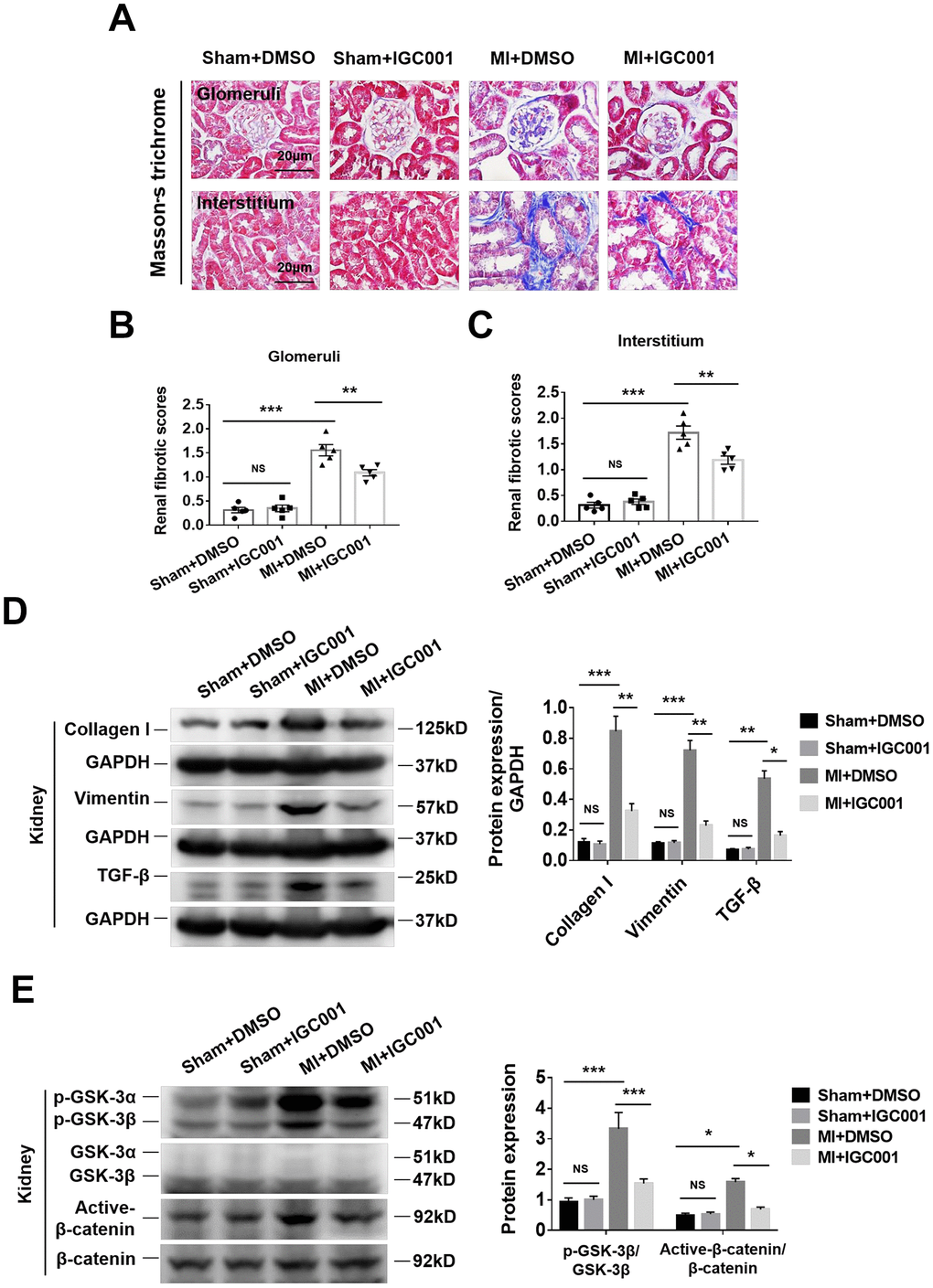 Renal glomerular and renal interstitial fibrosis were significantly enhanced in CRS mice than in sham mice, while treatment with β-catenin antagonist IGC001 suppressed this effect (Figure 5A–5C). Western blot analysis demonstrated that expression of collagen I, vimentin and TGF-β was significantly elevated in CRS mice compared with sham mice, and the upregulation of these proteins was suppressed by IGC001 treatment (Figure 5D). Similar results were obtained for both p-GSK-3β and active-β-catenin (Figure 5E).