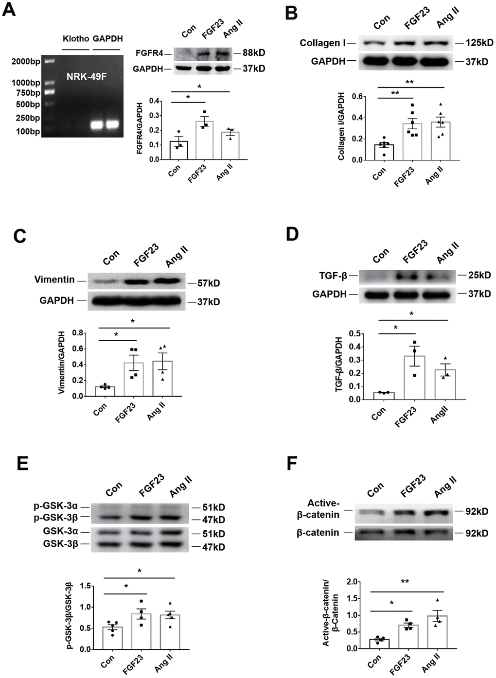 A normal rat kidney fibroblast cell line NRK-49F was cultured for 24 h in the presence/absence of 1μM angiotensin II (Ang II; Sigma-Aldrich, Darmstadt, Germany) or 100 ng/mL recombinant FGF23 (2629-FG-025, R&D Systems, MN, USA) or 100nM BLU9931 (a specific FGFR4 antagonist, Selleck, TX, USA) or 10μM IGC001. The concentration of recommended FGF23 protein in our study was determined according to previous reports [69] and our preliminary experiments. Then the cells were harvested at the indicated times for real-time PCR or western blotting.