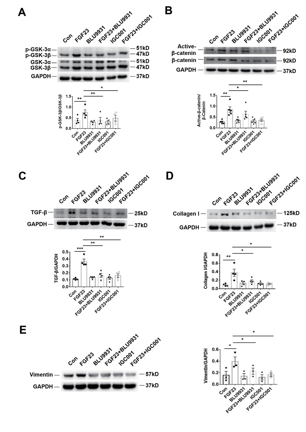 In the rat renal fibroblast cell line NRK-49F, expression of Klotho mRNA was undetectable, but FGFR4 protein was detected (Figure 6A). Western blot analysis demonstrated that incubation with recombinant FGF23 significantly upregulated collagen I, vimentin, TGF-β, p-GSK-3β, and active-β-catenin proteins, similar to the pro-fibrotic agent angiotensin II (Figure 6B–6F). Recombinant FGF23 also upregulated the expression of TGF-β and collagen I mRNA in cultured NRK-49F cells (Supplementary Figure 6A, 6B). In addition, FGF23 had a certain proliferative effect on fibroblasts (Supplementary Figure 6C). To investigate the role of FGFR4 and β-catenin in the pro-fibrosis of FGF23, we co-stimulated NRK-49F cells with recombinant FGF23 and FGFR4 inhibitor BLU9931, or β-catenin inhibitor IGC001. Western blot results showed that recombinant FGF23 significantly upregulated p-GSK-3β, active-β-catenin, TGF-β, collagen I and vimentin proteins, and the expression of these proteins was apparently suppressed by treatment with BLU9931 or IGC001 (Figure 7A–7E).