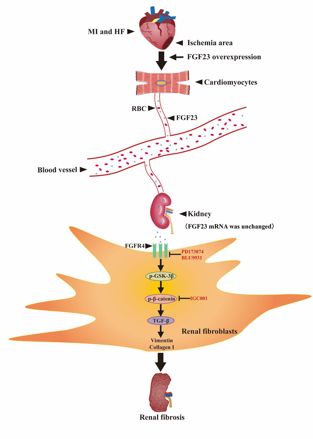 In summary, our present findings indicate that excessive FGF23 can promote renal fibrosis in type 2 CRS mice by binding to FGFR4 and activating β-catenin signaling pathway (Figure 8).