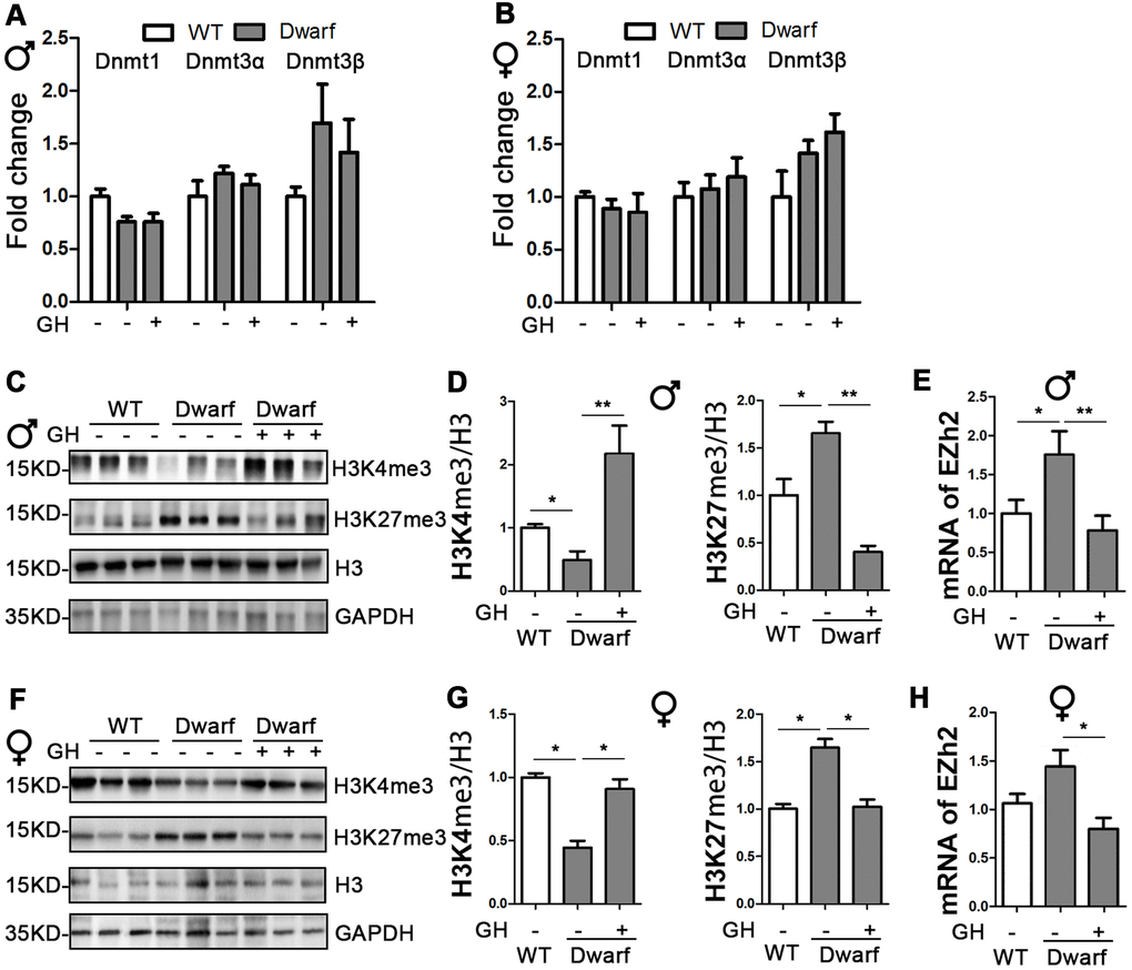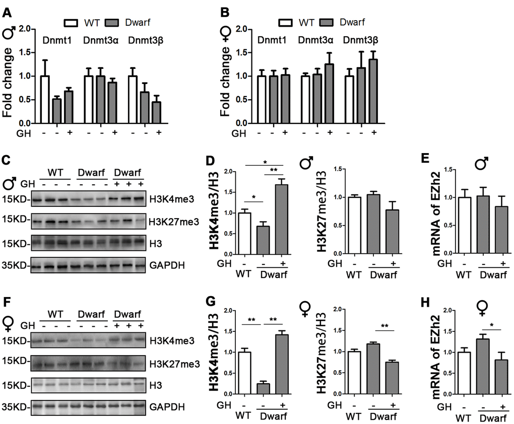 Histone H3 methylation on lysine residues plays an important role in aging and aging-related diseases [8]. Therefore, we examined aging-related histone H3 tri-methylation at lysine 4 and 27 residues in the liver. We found that protein level of H3K4me3 were significantly decreased in Ames dwarf mice compared with controls in both sexes (Figure 1C, 1D, 1F, 1G and Supplementary Figure 1). However, early-life GH intervention enhanced activation of H3K4me3 in both female and male Ames dwarf mice. This was especially pronounced in males in which that H3K4me3 was 1.6-fold increase in Ames dwarf mice compared with controls (Figure 1C, 1D, 1F, 1G and Supplementary Figure 1). Similar expression of H3K27me3 was observed in both Ames dwarf and control mice (Figure 1C, 1D, 1F, 1G and Supplementary Figure 1). Furthermore, early-life GH treatment led to a significant decrease in H3K27me3 level in females, while no difference was found in males (Figure 1F, 1G and Supplementary Figure 1). The tri-methylation of H3K27 is mediated by EZH2 to suppress gene expression [18]. We found that the mRNA level of EZH2 was decreased 40 % in female Ames dwarf mice upon early-life GH intervention (Figure 1E–1H).