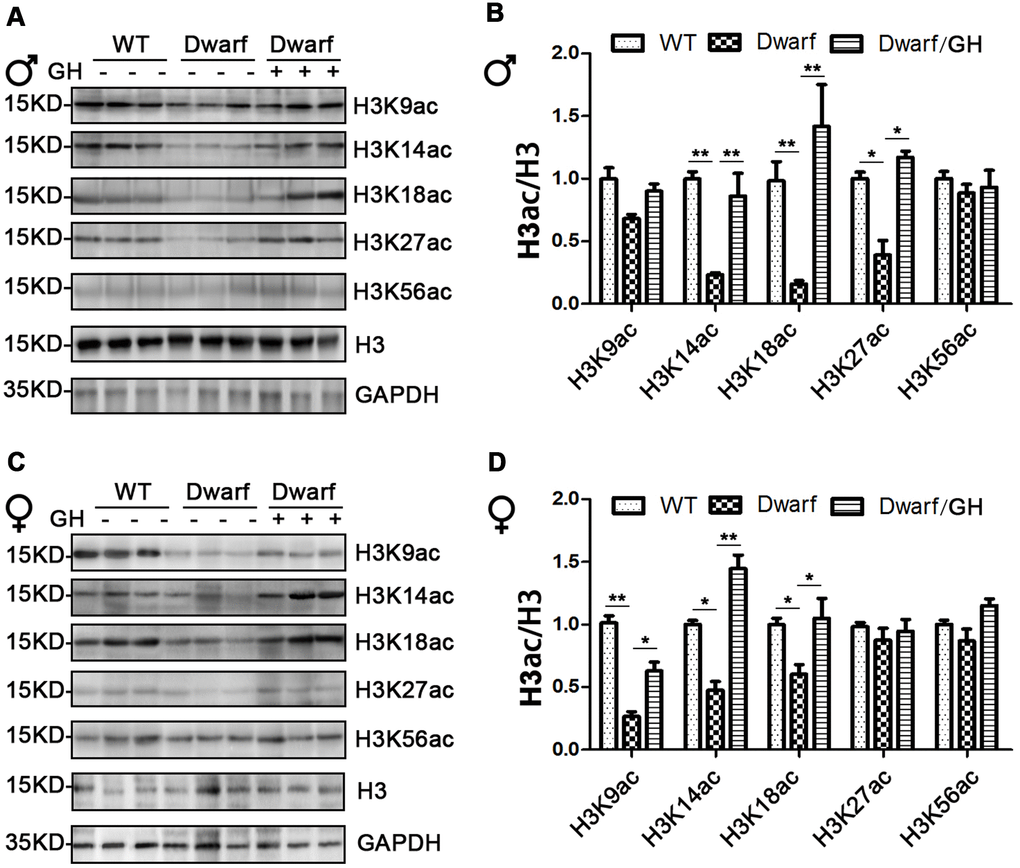 Genome-wide histone H3 acetylation at multiple lysine residues usually functions as positive regulator during aging [20]. To further understand the relationship between histone acetylation and gene regulation in aging, we investigated the site-specific acetylation of histone H3 in the liver of Ames dwarf mice. The expression of H3K9ac, H3K14ac, H3K18ac, H3K27ac and H3K56ac in the liver was similar between Ames dwarf mice and controls of both sexes (Figure 3 and Supplementary Figure 3). However, early life GH intervention significantly increased activation of H3K14ac and H3K18ac in males (4.2-fold in H3K14ac and H3K18ac, respectively) and females (4-fold in H3K14ac and 1.7-fold in H3K18ac, Figure 3 and Supplementary Figure 3). Additionally, expression of H3K56ac was significantly increased (7-fold) by GH intervention in early age in male Ames dwarf mice compared with controls (Figure 3C, 3D and Supplementary Figure 3).