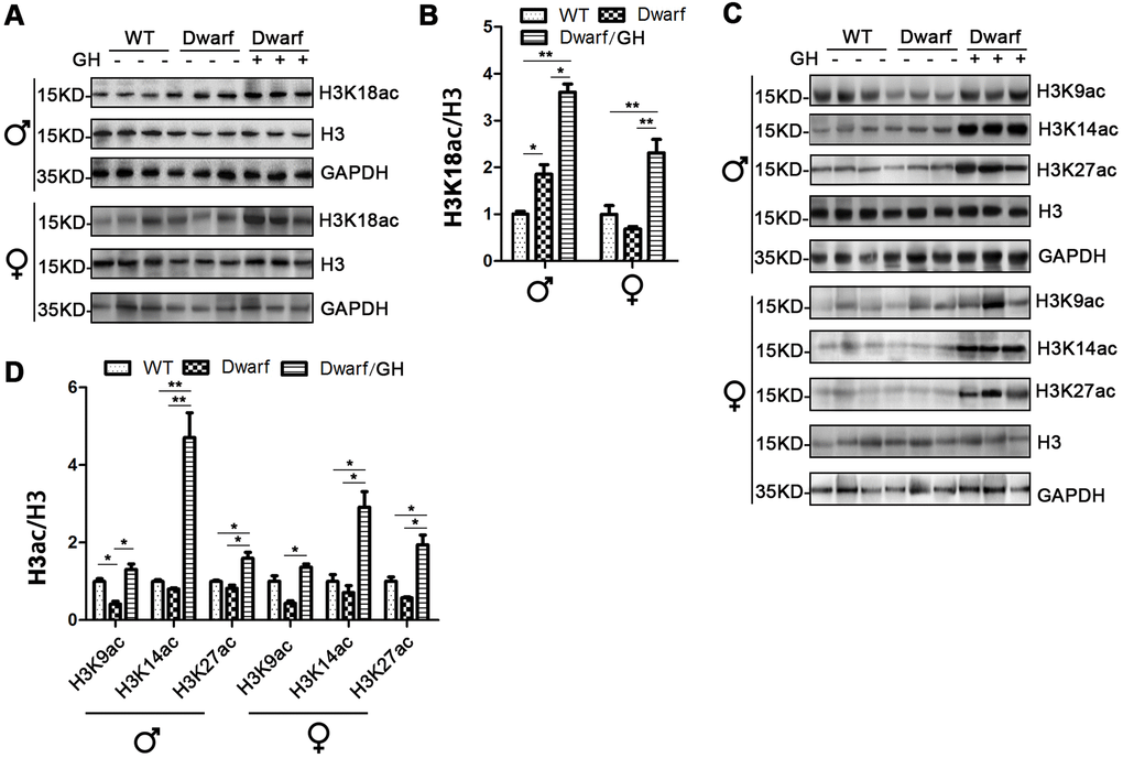 The data of H3 acetylation in subcutaneous adipose tissue showed that expression of H3K9ac was markedly decreased in male Ames dwarf mice compared with controls (Figure 5C, 5D and Supplementary Figure 6). However, the expression of H3K9ac, H3K14ac and H3K27ac was induced in both sexes of Ames dwarf mice upon GH intervention at early age (Figure 5C, 5D and Supplementary Figure 6). Early life GH intervention-induced activation of H3K14ac and H3K27ac was significantly higher in Ames dwarf mice (average 4-fold in H3K14ac and 2-fold in H3K27ac) than in the controls (Figure 5C, 5D and Supplementary Figure 6).
