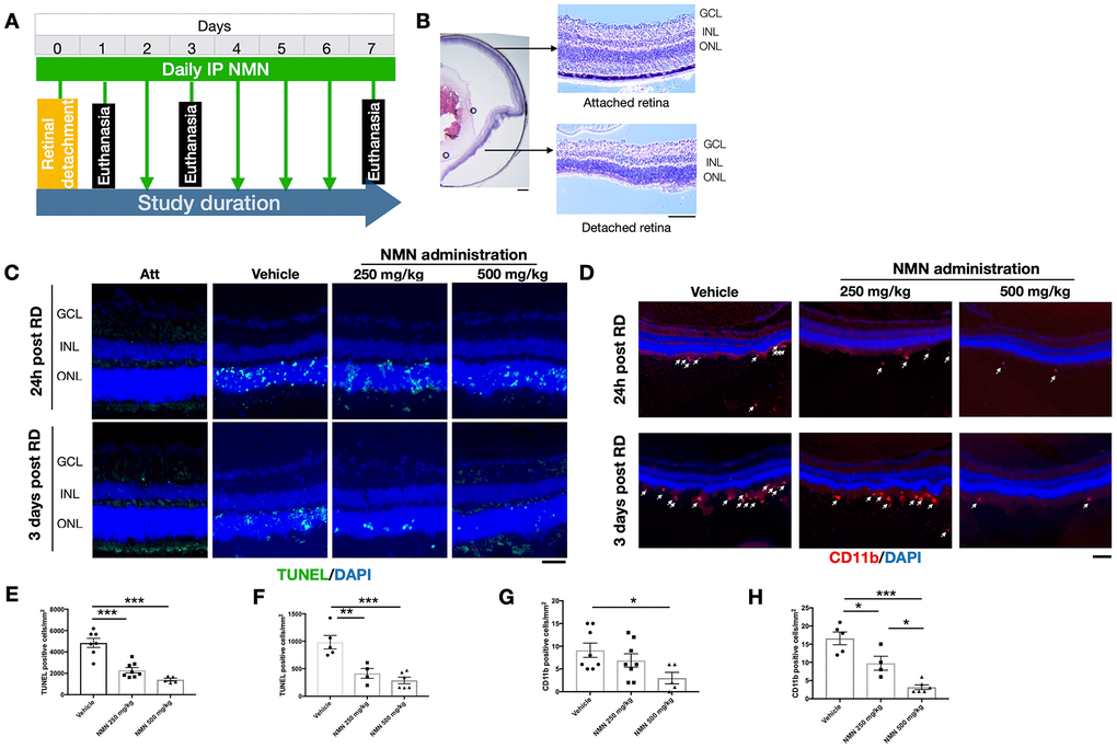 Mice were divided into the following groups: normal attached control group (Att), RD with PBS injection group (Vehicle), RD with 250 mg/kg NMN group and RD with 500 mg/kg NMN group. On the day of surgery, mice were undergoing the induction of RD followed by NMN or vehicle injections half an hour later. Daily injections of NMN or vehicle were then performed at the end of the light phase. Retina tissues were harvested at 3 time points: 24 hours, 3 days and 7 days post RD. A separate group of mice received NMN administration at Day 3 post RD, and then with daily injections of NMN till the Day 7 post RD.