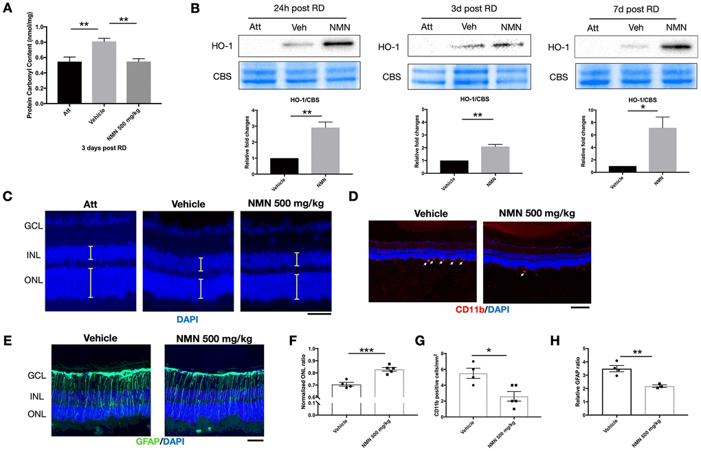 In conclusion, our study demonstrates the neuroprotective effects of NMN supplementation in rescuing photoreceptor degeneration after RD. NMN treatment was associated with an increase in NAD+ and SIRT1 levels in the injured retina, leading to anti-apoptotic, anti-inflammatory, and antioxidant effects. The therapeutic effect of NMN may occur at least partially through the activation of SIRT1/HO-1 signaling. These results provide an impetus for studies in larger animals and humans with photoreceptor degeneration in a clinical setting.