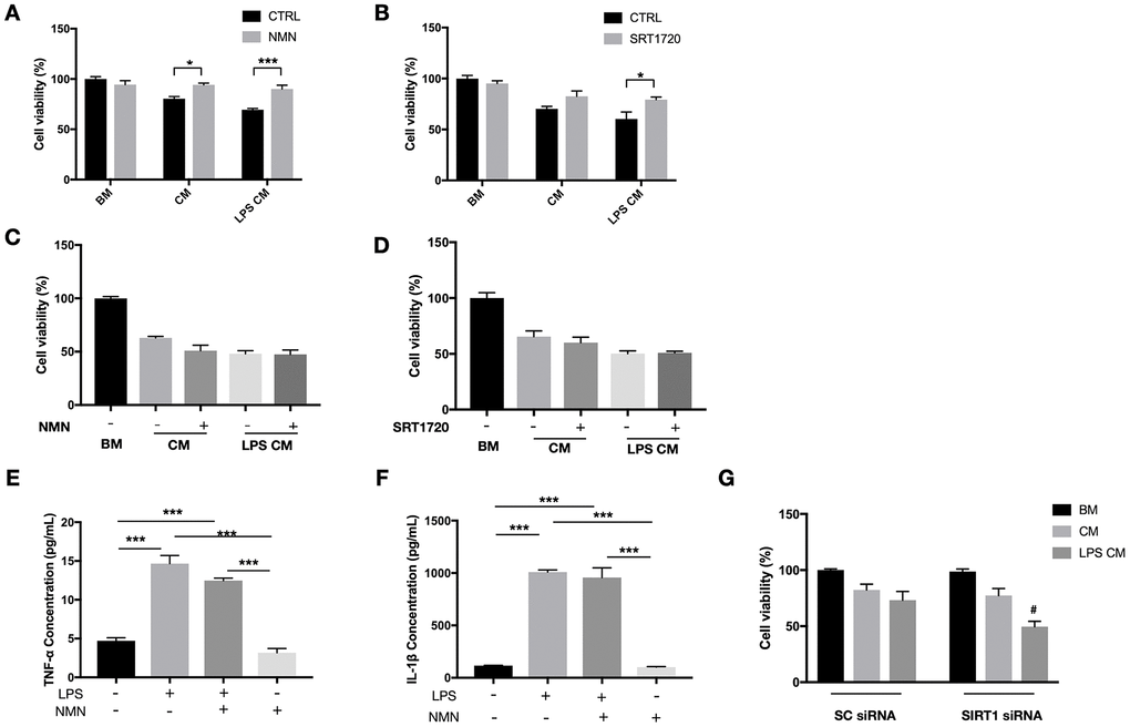 In the macrophage CM toxicity model, RAW264.7 cells were cultured and stimulated with or without LPS. The CM samples were collected to culture 661W. Cell viability tests were performed to determine the effects of NMN or SRT1720 administration. Besides, NMN or SRT1720 was also administrated in the RAW264.7 cells with or without LPS stimulation, CM was collected to culture 661W, and the cell viability was tested under these conditions.