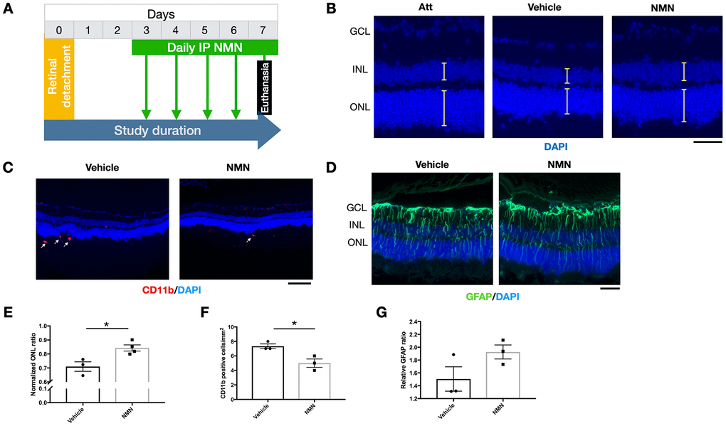 To be more relevant to clinical settings, we administrated NMN at Day 3 post RD and evaluated the effects on the retina at Day 7 post RD (Figure 7A). Our results showed a preserved ONL thickness in comparison to the vehicle group (Figure 7B–7E), along with an inhibitory effect of infiltrating CD11b+ macrophages compared to the vehicle group (Figure 7C–7F). GFAP was unaltered (Figure 7D–7G). These results showed that delayed NMN administration can still exert protective effect after RD.