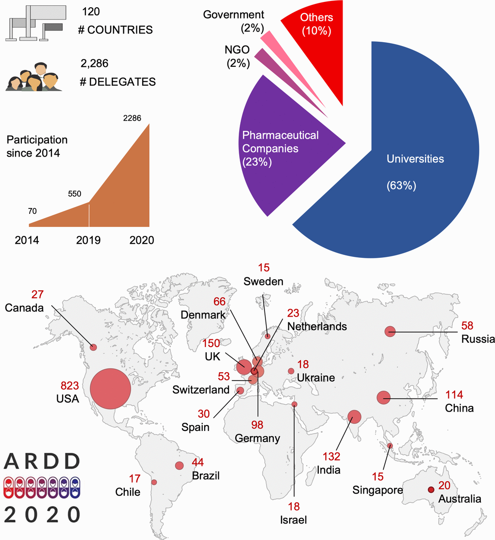 A tremendous growth in the proportion of elderly people raises a range of challenges to societies worldwide. Healthy aging should therefore be a main priority for all countries across the globe. However, science behind the study of age-associated diseases is increasing and common molecular mechanisms that could be used to dissect longevity pathways and develop safe and effective interventions for aging are being explored. In this regard, novel methodologies using the power of artificial intelligence (AI) are emerging to cope with the massive amount of data that are becoming available [1]. A collaborative effort based on transfer of technology and knowledge between academia and industry is also needed to accelerate aging discoveries and facilitate better transition of effective interventions into clinics. To accelerate this, the Aging Research and Drug Discovery (ARDD) meeting was founded seven years ago in Basel, Switzerland. This year’s meeting, organized by Alex Zhavoronkov, Insilico Medicine, Morten Scheibye-Knudsen, University of Copenhagen and Daniela Bakula, University of Copenhagen, was particularly challenging due to the ongoing COVID-19 pandemic. The 7th ARDD meeting, 1st to 4th of September 2020, moved online with local hosting at the University of Copenhagen. We were very fortunate to have 65 fantastic speakers and more than 2200 ‘ARDDists’ (Figure 1). This report provides an overview of the presentations covering topics on some of the latest methodologies to study aging, molecular characterization of longevity pathways, existing aging interventions and the importance of aging research for the global society and economy.