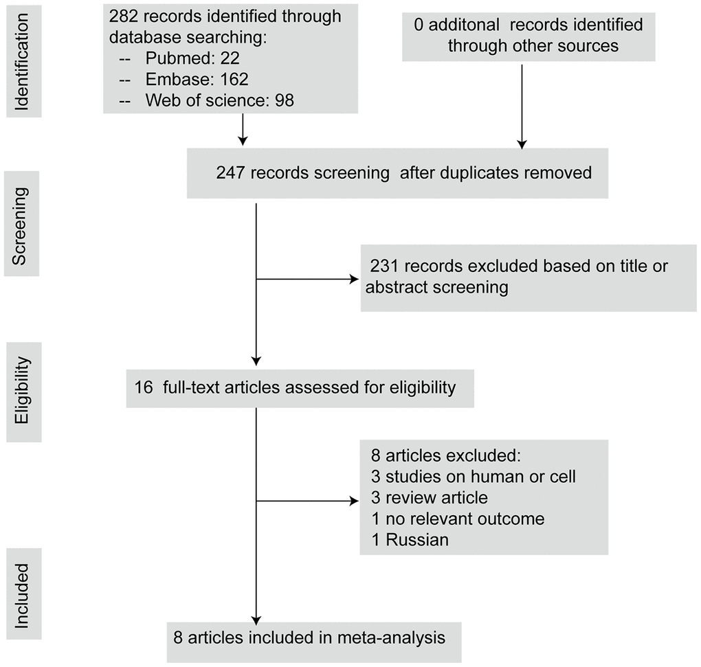 The systematic review and meta-analysis were conducted and reported in compliance with Preferred Reporting Items for Systematic Review and Meta- Analyses (PRISMA) guidelines [22]. The literature search identified 282 potential studies, at the primary retrieval. After review and exclusion, 16 full-text articles remained, which were then assessed for inclusion eligibility. From these, 8 records were excluded due to the reasons given in Figure 1. Finally, this systematic review included eight articles published from 2008 to 2019 that met the inclusion criteria, which comprised 15 comparisons describing the neurobehavioral scores and 14 comparisons describing the brain water content.
