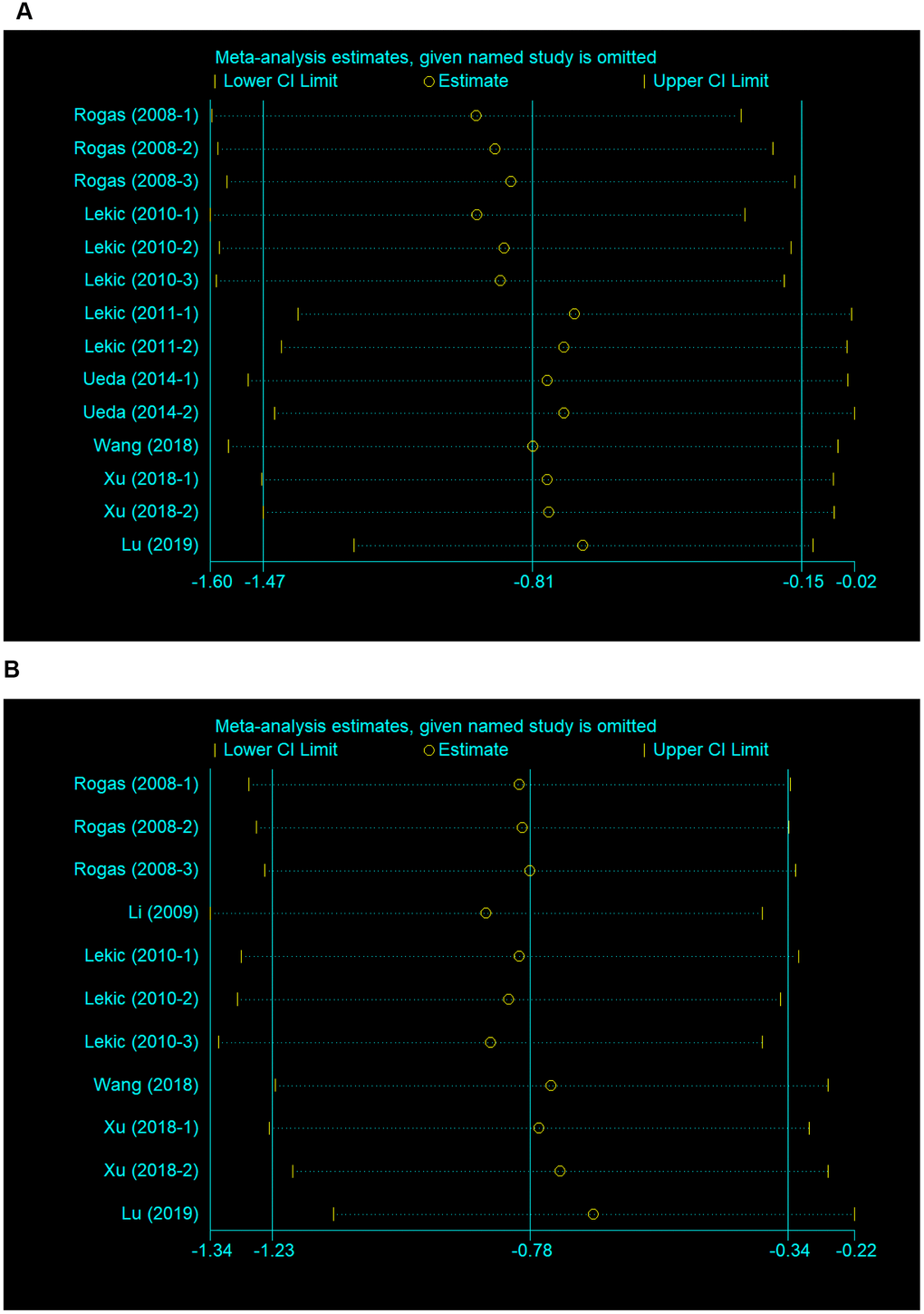 We conducted a sensitivity analysis to evaluate the stability of the results by sequential omission of each study if heterogeneity between the studies existed. The pooled SMD of neurobehavioral outcome was not significantly affected by any study, nor was the brain water content (Figure 3A, 3B).