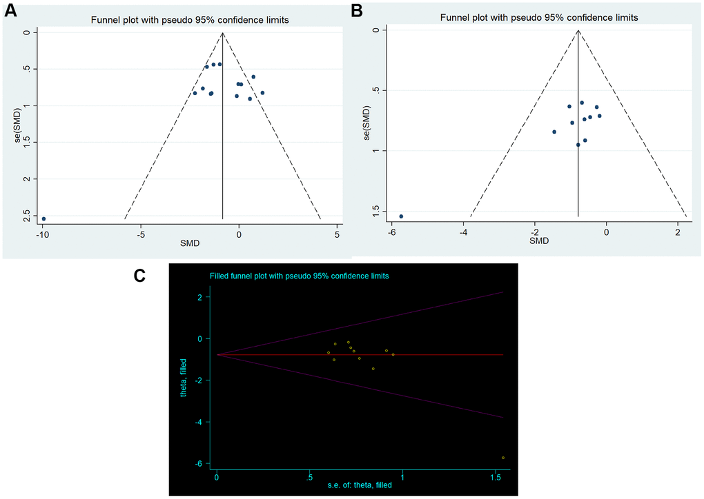 For the comparisons of brain water content, the funnel plot showed some asymmetry, which may suggest the presence of publication bias (Figure 4B). The results from the Egger test confirmed significant bias (p=0.007). Then, we used the trim-and-fill method to estimate missing studies and recalculated the overall pooled effect estimates. The imputed effect estimates were consistent (SMD -0.784, 95% CI: -1.230 to -0.338, p =0.001), indicating no “missing” studies (Figure 4C).