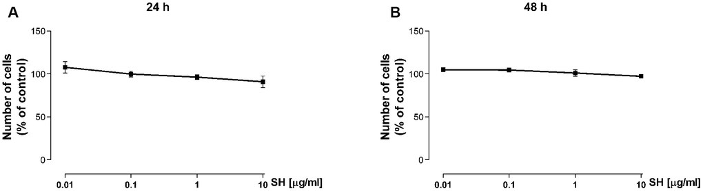 ROS were quantified using 2′,7′-dichlorofluorescin-diacetate (H2-DCF-DA, Sigma-Aldrich, St Louis, MO, USA), as previously described [48]. Briefly, cells (5x103) were seeded into 96-well plates, allowed to adhere overnight and then exposed to SH extract for 3 or 24 hours. N-acetylcysteine 5mM (Sigma-Aldrich, St Louis, MO, USA) was used as positive control.