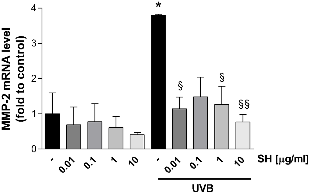 Results in Figure 10 show that UVB radiation increases the mRNA expression of the gelatinase MMP-2 which degrades basement membrane collagens and denatured structural collagens [38]. Treatment with SH is able to significantly reduce MMP-2 mRNA levels (SH 0.01-0.1-10 μg/ml) indicating activity of SH extract in the maintenance of the structural integrity of the skin, damaged by photo-stress.