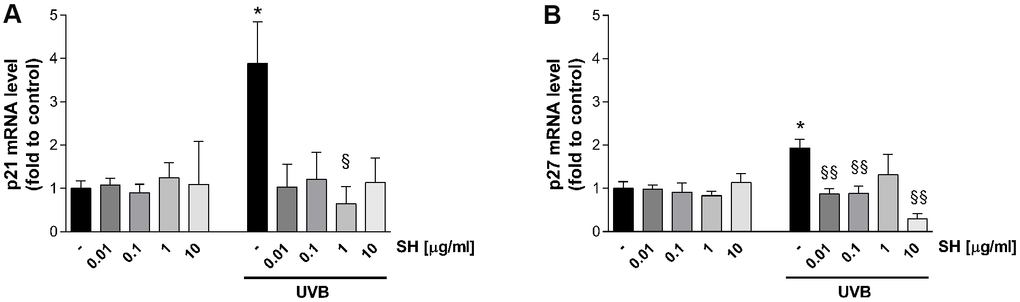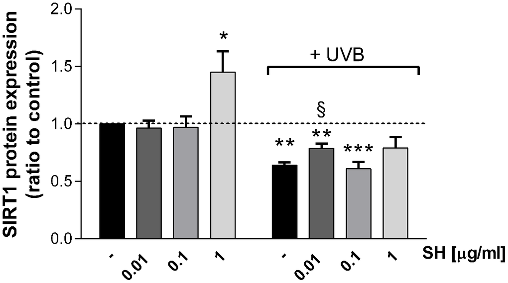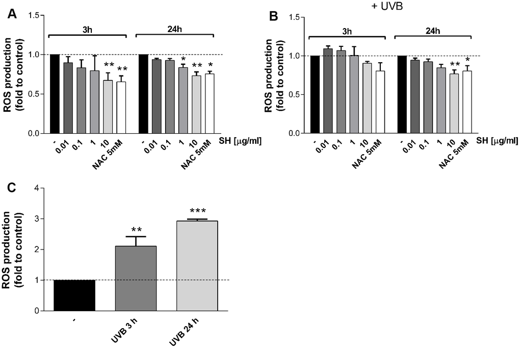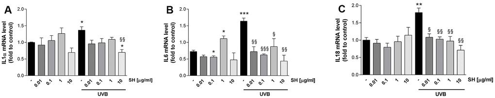 It is also established that senescent cells negatively affect the microenvironment by secreting a pro-inflammatory mixture of chemokines, cytokines, growth hormones and proteases, known as senescence-associated secretory phenotype (SASP) [28]. Results in Figure 5 show that UVB stimulation induces a significant increase in IL1α (A), IL6 (B), and IL18 (C) mRNA levels with respect to the unstimulated control. Pretreatment with SH presents a strong activity in counteracting the increase in cytokine levels. As shown in Figure 5A, SH 10 μg/ml significantly decreased IL1α levels; the increase in IL6 is significantly counteracted by SH 0.01,0.1 and 10 μg/ml (Figure 5B) while all the tested concentrations are able to significantly reduce IL18 levels (Figure 5C).