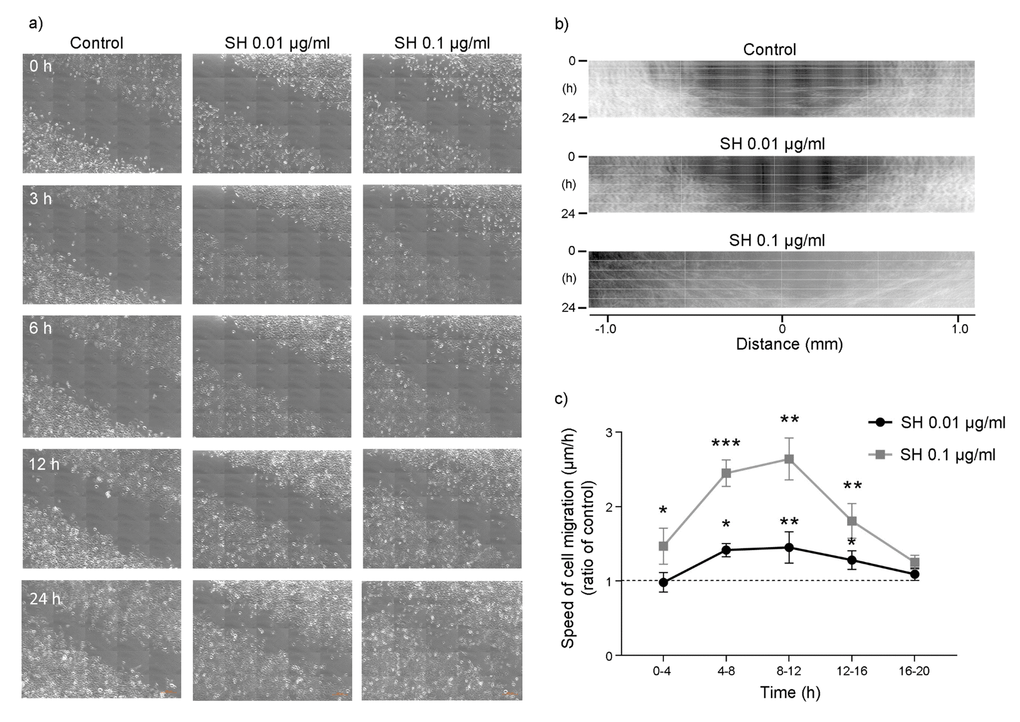 Keratinocytes are the main constituents of epidermis, providing a barrier between the organism and the environment. Therefore, their proliferation and migration play a key role in the maintenance of an effective barrier and in wound healing following injuries [30, 31]. Thus, the effect of SH on HaCaT cell migration was evaluated. Images in Figure 7A show that treatment with SH leads to a reduction in the thickness of the scratch indicating an effect on HaCaT cell migration. Figure 7B reports kymograms construction of the migration velocity of HaCaT cells; images show a concentration-dependent increase in cells migration. Graph in Figure 7C indicates a significant increase in cells migration speed after 4-8 hours of treatment with 0.01 μg/ml SH extract. The maximum increase is reached in the 8-12 hours interval, where the rate in cell migration speed of cells is about 165% with respect to the control. These data, as the results obtained on cell proliferation, indicate that the lowest concentration of SH extract is able to induce an increase in cell migration speed not related to a hyperproliferative phenotype.
