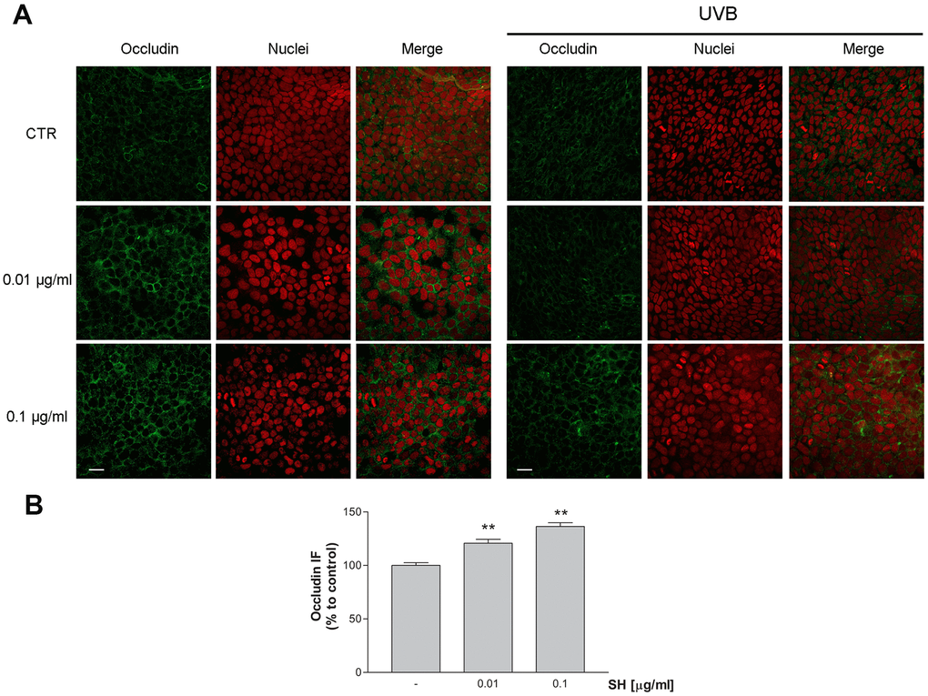 In order to evaluate Salvia haenkei extract’s effect as possible protective agent against TJs disruption, expression of occludin was measured by immunocytochemistry following exposure to UVB radiation. Images in Figure 8A, 8B show that treatment with both concentrations of SH induces an increase in occludin protein expression, promoting junction’s formation useful to the maintenance of the epidermal barrier integrity. As expected, following exposure to UVB radiation, cells show an irregular and not defined membrane ring (Figure 8A). SH treatment, especially at the higher concentration, preserves the morphology of the membrane maintaining the structure comparable to the unstimulated control. SH extract promotes junction’s reinforcement and prevents the damage induced by UVB exposure, maintaining the functionality of the skin barrier.