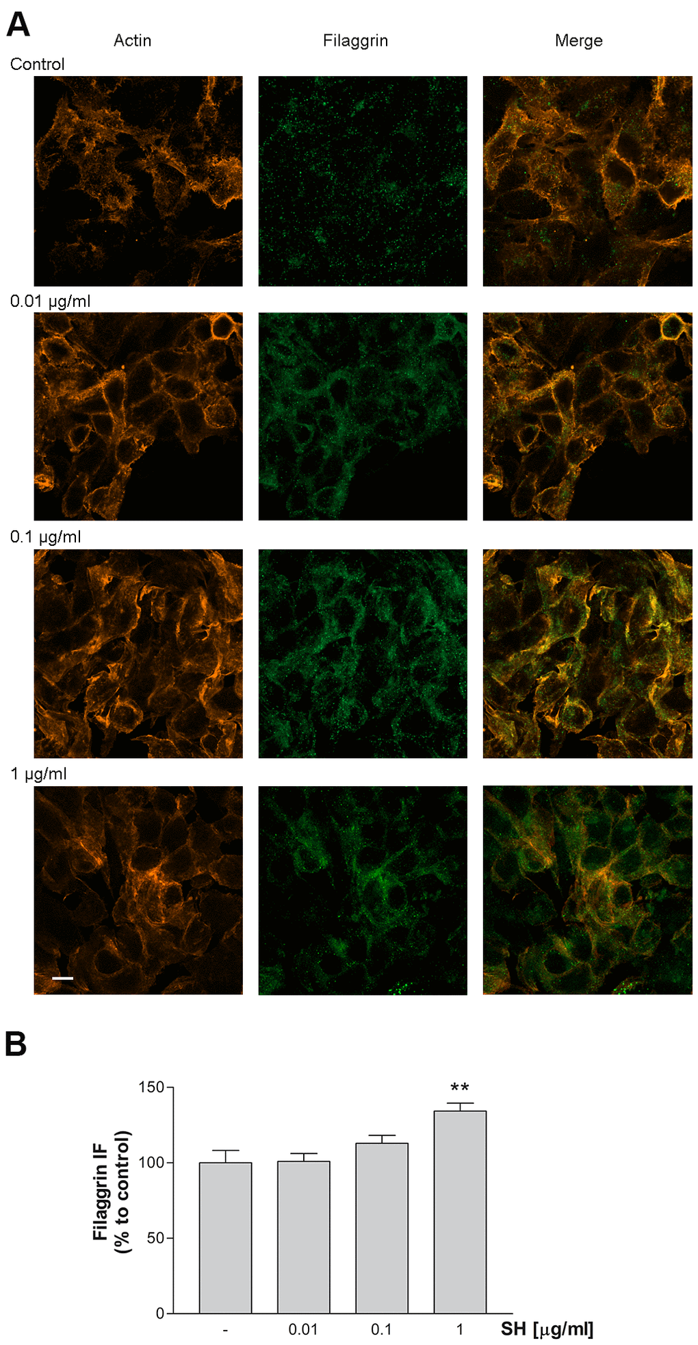 10x104 cells were seeded on glass coverslips precoated with collagen in 24-well plates, allowed to attach overnight, and treated with SH extract according to protocol. For detection of β-catenin and occludin proteins, cells were exposed to UVB radiation, as described in the protocol above. After irradiation, cells were fed with fresh growth medium or used for experiment following the protocol. For immunofluorescence assay, 4 hours after the UVB irradiation, cells were washed, fixed with 4% formaldehyde, permeabilized with 0.1% Triton X-100 in PBS and stained for 1 hour at 37° C with different protein-specific antibody: mouse monoclonal anti-occludin Invitrogen Life Technologies, Waltham, MA, USA mouse anti-filaggrin (Sigma-Aldrich, St Louis, MO, USA). After PBS wash, cells were incubated with secondary antibodies/fluorescein isothiocyanate (Alexa Fluor 488 anti-mouse or Alexa Fluor 536 anti-rabbit immunoglobulin G, Molecular Probes, Invitrogen Life Technologies, Waltham, MA, USA) and with phalloidin for 1 hour at room temperature. Following 10 minutes of treatment with RNase, the coverslips were mounted on glass slides by using Mowiol 40–88 (Sigma-Aldrich, St Louis, MO, USA) added of propidium iodide. Images were acquired through confocal microscope LSM 800, magnification 60X, software ZN 2.1 blue Edition (Carl Zeiss, Jenza, Germany) and quantified using ImageJ software.