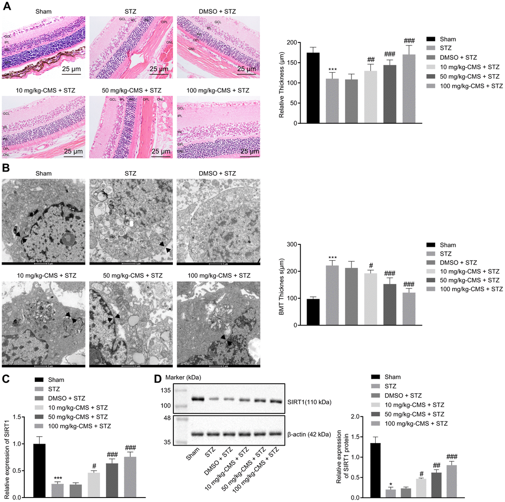 First, to study the effects of CMS on DR, we established the rat model of DR using an intraperitoneal injection of STZ, administered at a dose of 60 mg/kg. A blood glucose level over 16.7 mmol/L at 48 h was indicative of successful model establishment. The age-matched sham-operated rats were administrated with an equivalent same volume of sodium citrate before CMS treatment. Two weeks after STZ induction, the rats were treated with DMSO, 10 mg/kg CMS, 50 mg/kg CMS, and 100 mg/kg CMS. HE staining was subsequently conducted to observe the structural integrity of retinal tissues of rats following DR induction. This examination revealed that the vascular intima of retinal tissues in the sham-operated rats consisted of a layer of intact and continuous endothelial cells without hyperplasia. In comparison with the sham-operated rats, the STZ-treated rats exhibited obvious edema, capillary wall thickening, endothelial cell hyperplasia and fibrous tissue hyperplasia, all of which could be partially relieved by administering CMS in a dose-dependent manner (Figure 1A). Next, the ultrastructure of retinas was observed under a transmission electron microscope (TEM), which showed that, compared with the sham-operated rats, the BMT value in STZ-treated rats was increased, while treatment with CMS decreased the BMT values in a dose-dependent manner (Figure 1B). In addition, the results of RT-qPCR and Western blot analysis showed that, compared with the sham-operated rats, the expression of SIRT1 was notably decreased in STZ-treated rats, which was restored by CMS treatment in a dose-dependent manner (Figure 1C, 1D). Therefore, the expression of SIRT1 was inhibited in STZ rats, and CMS could elevate the expression of SIRT1 in STZ rats.