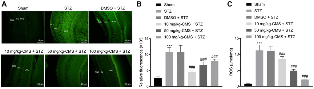 A total of 80 specific pathogen-free (SPF) grade male Sprague-Dawley (SD) rats weighing 250 - 300 g were purchased from Hunan SJA Laboratory Animal Co., Ltd. (Changsha, China). Among the mice, 15 sham-operated rats were fed a normal diet while another 60 rats were fed a high-fat diet. After a 12 h period of fasting, the rats on a high-fat diet were administered an intraperitoneal injection with STZ dissolved using 0.1 mol/L citrate buffer (pH = 4.5) at a dose of 60 mg/kg. After 72 h, blood samples were harvested from the tail vein and the blood glucose level was measured. The sham-operated rats were injected with an equal dose of citric acid buffer and the blood glucose was measured using the off-line blood glucose monitoring system (Glucotrend-2; Roche Diagnostics GmbH, Mannheim, Germany). A blood glucose level exceeding 16.7 mmol/L for a week was indicative of successful DR model establishment [33, 34]. The STZ-treated rats were administered an intraperitoneal injection with an equal volume of dimethyl sulfoxide (DMSO) or CMS. In brief, 100% DMSO was added to dilute the CMS, and from the day of model establishment by STZ, the STZ-treated rats were subcutaneously injected with DMSO (n = 15), 10 mg/kg (n = 15), 50 mg/kg (n = 15) and 100 mg/kg (n = 15) CMS for 8 weeks, respectively. The rats in the sham and STZ groups were administered with equal volumes of normal saline.