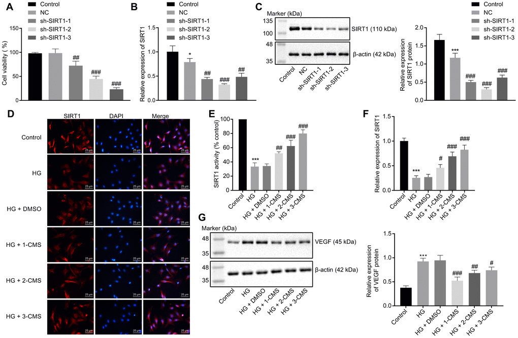 After establishing that that CMS could increase SIRT1 expression in STZ-treated rats, we next aimed to investigate the interaction between CMS and SIRT1 in hRMECs under HG conditions by conducting SIRT1 loss-of-function and rescue experiments. The viability of hRMECs was decreased at 48 h following transfection with sh-SIRT1-1, sh-SIRT1-2, or sh-SIRT1-3 (Figure 4A). The results of RT-qPCR and Western blot analysis demonstrated that the expression of SIRT1 was diminished in hRMECs transfected with sh-SIRT1-1, sh-SIRT1-2, or sh-SIRT1-3 (Figure 4B, 4C), where sh-SIRT1-2 exhibited the strongest silencing effect, and was therefore selected for subsequent experimentation. Immunofluorescence staining revealed that stimulation with HG decreased the activity and nuclear accumulation of SIRT1 in hRMECs; however, CMS treatment resulted in dose-dependent increases of SIRT1 in HG-exposed hRMECs, with 3-CMS showing a more pronounced elevation (Figure 4D, 4E). According to the results of RT-qPCR, the expression of SIRT1 was decreased in hRMECs stimulated with HG, while CMS treatment led to dose-dependent increases in the expression of SIRT1 in HG-exposed hRMECs, with the highest SIRT1 expression evident upon 3-CMS treatment (Figure 4F). Hence, 3-CMS was selected for subsequent experimentation. Meanwhile, we tested the effect of CMS on the expression of VEGF protein by performing Western blot analysis, which showed increased VEGF protein level in HG-treated hRMECs, whereas further CMS treatment provoked a dose-dependent decrease in the VEGF protein level (Figure 4G). Thus, from the preceding, we find that CMS exhibited the potential to enhance the SIRT1 expression while downregulating the VEGF expression in HG-exposed hRMECs.