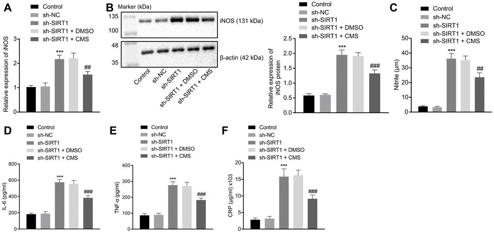 To evaluate whether CMS regulated oxidative stress and inflammation through SIRT1, we silenced the SIRT1 expression in hRMECs. The results of DCFDA and lipid peroxidation MDA assays illustrated that the levels of ROS and MDA were augmented, while the activity of SOD was diminished by SIRT1 silencing in hRMECs. However, CMS reversed the effects of sh-SIRT1 on the expression pattern of oxidative stress-related factors in hRMECs (Figure 5, Table 2). In addition, the results of RT-qPCR and Western blot analysis demonstrated that the iNOS expression was elevated by SIRT1 silencing in hRMECs, however this increase could be reduced by CMS treatment (Figure 6A, 6B). The nitrite test revealed that the expression of NO was increased in hRMECs in the absence of SIRT1, but that this effect was reversed by CMS treatment (Figure 6C). According to the results of ELISA, hRMECs had increasing concentrations of IL-6, TNF-α, and CRP upon SIRT1 knockdown, while concomitant CMS treatment reversed these elevations of inflammatory markers (Figure 6D–6F). Therefore, CMS was effective in alleviating the oxidative stress and inflammation in hRMECs through activating SIRT1.