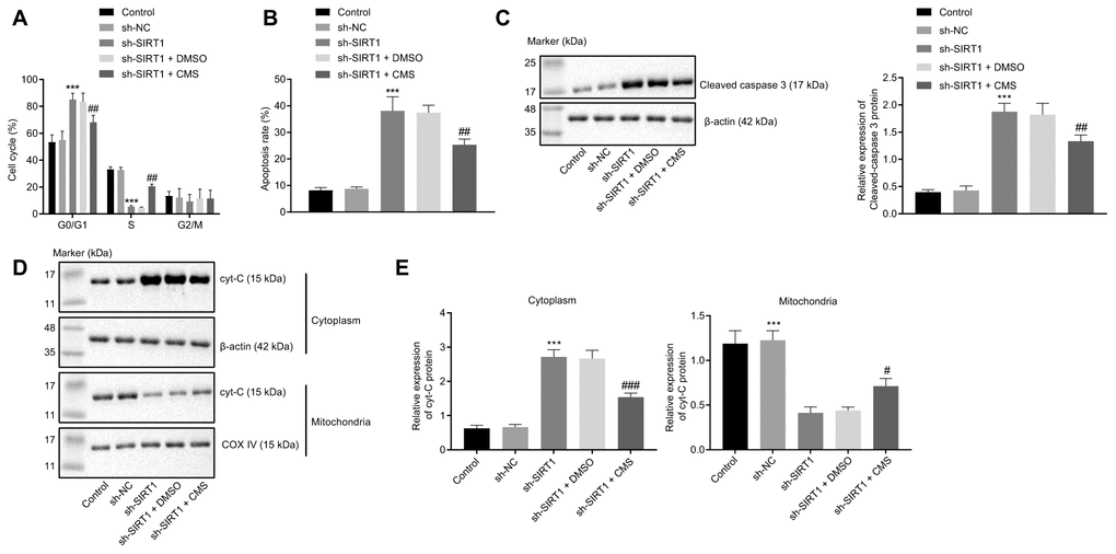 At last, to illustrate whether CMS mediated SIRT1 in the process of cell apoptosis, we evaluated cell apoptosis and assessed the expression patterns of several apoptosis-related factors in hRMECs after CMS treatment and/or SIRT1 knockdown. Flow cytometry showed that the apoptosis rate of hRMECs was increased upon SIRT1 knockdown, which could be reversed by CMS treatment (Figure 7A, 7B). Furthermore, Western blot analysis showed that hRMECs treated with sh-SIRT1 exhibited a higher expression of cleaved caspase-3, which could be diminished by CMS treatment (Figure 7C). Additionally, Cyt-C protein expression was amplified in the cytoplasm of hRMECs treated with sh-SIRT1, but this enhancement was impeded by CMS treatment (Figure 7D, 7E). On the whole, these data suggested that CMS could inhibit the apoptosis of hRMECs by activating the expression of SIRT1.