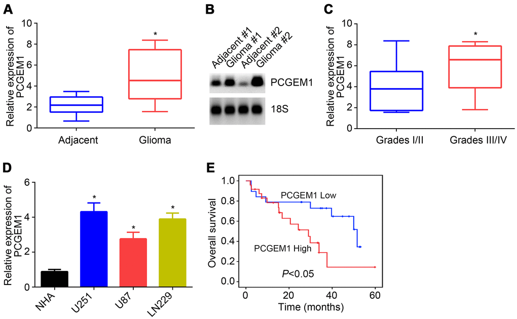 The expression of PCGEM1 in 43 glioma tissues and their corresponding adjacent normal tissues was analyzed through qRT-PCR. Results showed that PCGEM1 level was increased in glioma tissues (Figure 1A), which was confirmed by Northern blot analysis (Figure 1B). These glioma tissues were divided into two subgroups based on WHO grades. qRT-PCR indicated that PCGEM1 expression was higher in glioma tissues with graded III/IV (Figure 1C). qRT-PCR found that PCGEM1 levels were raised in glioma cell lines compared to NHA cells (Figure 1D). Finally, the survival rate of patients with glioma observed in the clinic was analyzed based on PCGEM1 expression. Results showed that PCGEM1 high expression was associated with poor prognosis (Figure 1E).