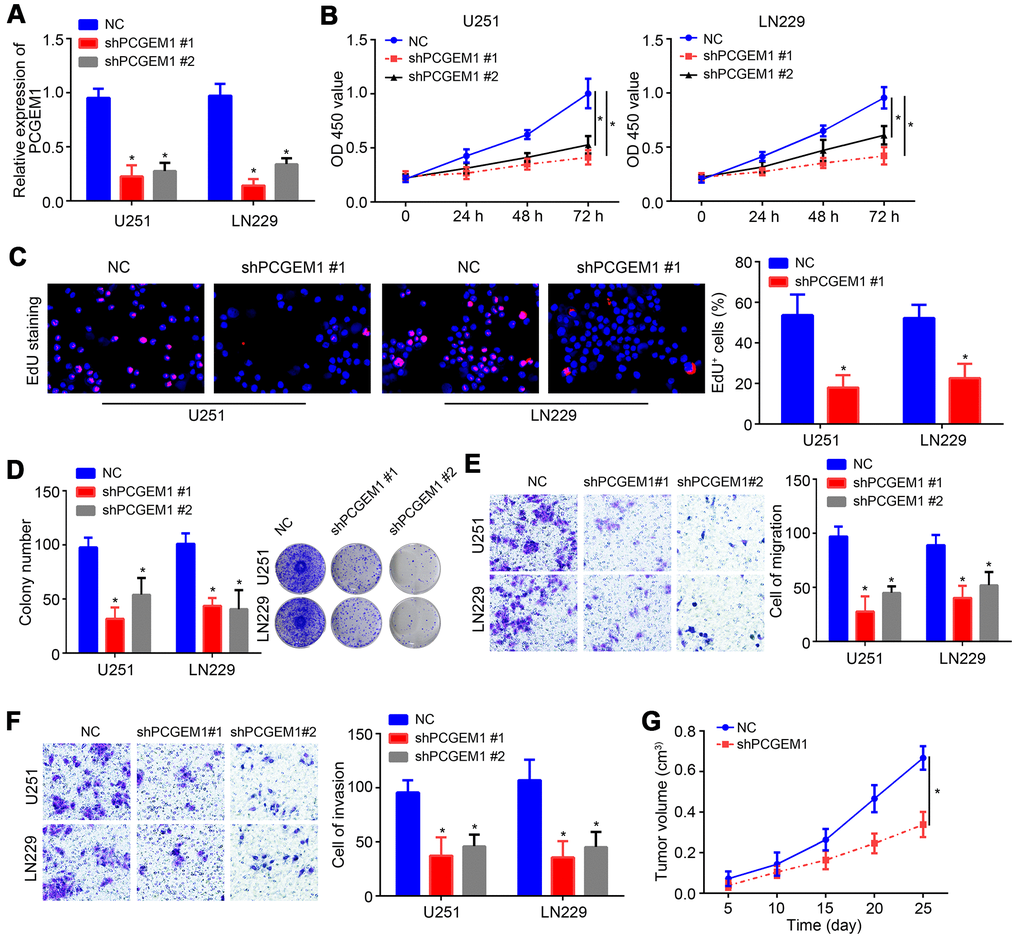 To investigate the role of PCGEM1, shRNA targeting PCGEM1 was utilized and transfected into U251 and LN229 cells. PCGEM1 expression was successfully knocked down by shPCGEM1 (Figure 2A). Results from CCK8 assay showed that PCGEM1 knockdown delayed glioma cell growth (Figure 2B). The EdU positive cells were fewer in shPCGEM1 group than that in NC group (Figure 2C). Colony formation assay also confirmed that PCGEM1 knockdown inhibited glioma cell proliferation (Figure 2D). Transwell assay showed that PCGEM1 knockdown suppressed the cell numbers of migration and invasion (Figure 2E, 2F). Moreover, animal xenograft experiment was performed and PCGEM1 knockdown delayed tumor growth in vivo (Figure 2G).